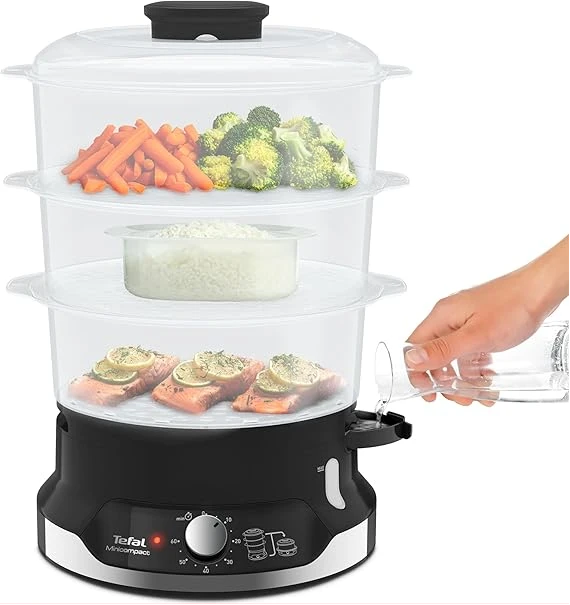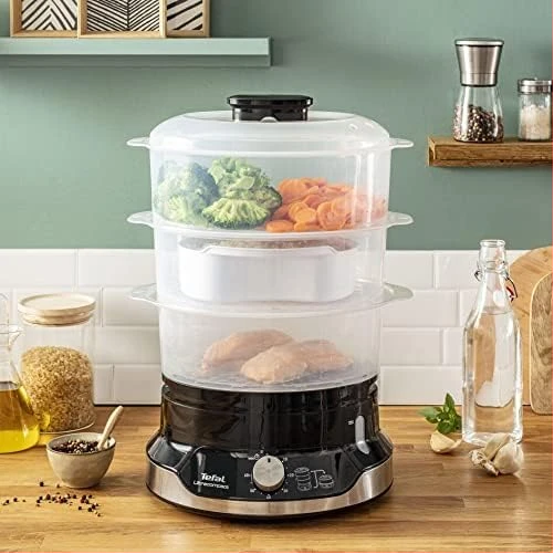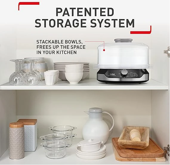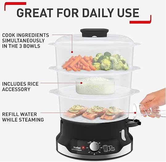Key Features: Healthy Cooking: Low-fat steam cooking maintains maximum vitamins and nutritional value ; BPA-free bowls for total peace of mind Easy to use: Smart features like a 60-minute timer, an indicator light during heating, 6 spots in each bowl to cook eggs, an easily viewable water level and unlimited autonomy with the ability to refill water while steaming is in progress Easy to store: A convenient steam cooker with a patented ultra-compact storage system with stackable bowls (including rice bowl) on the base Perfect capacity: The large 9 L capacity 3-bowl multi-tier system uses three steaming bowls at once, saving time while offering enough for special occasions and everyday use Generous rice bowl: A large 1 L rice bowl, ensuring enough rice for the whole family