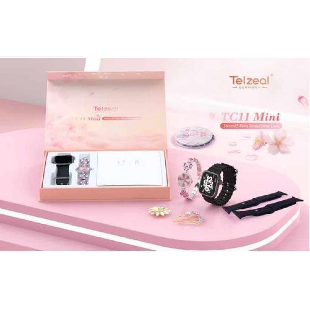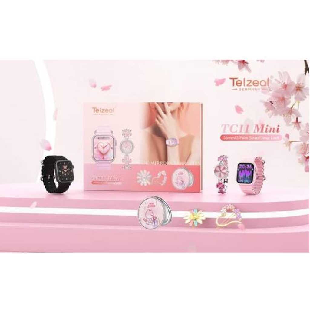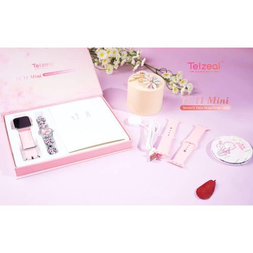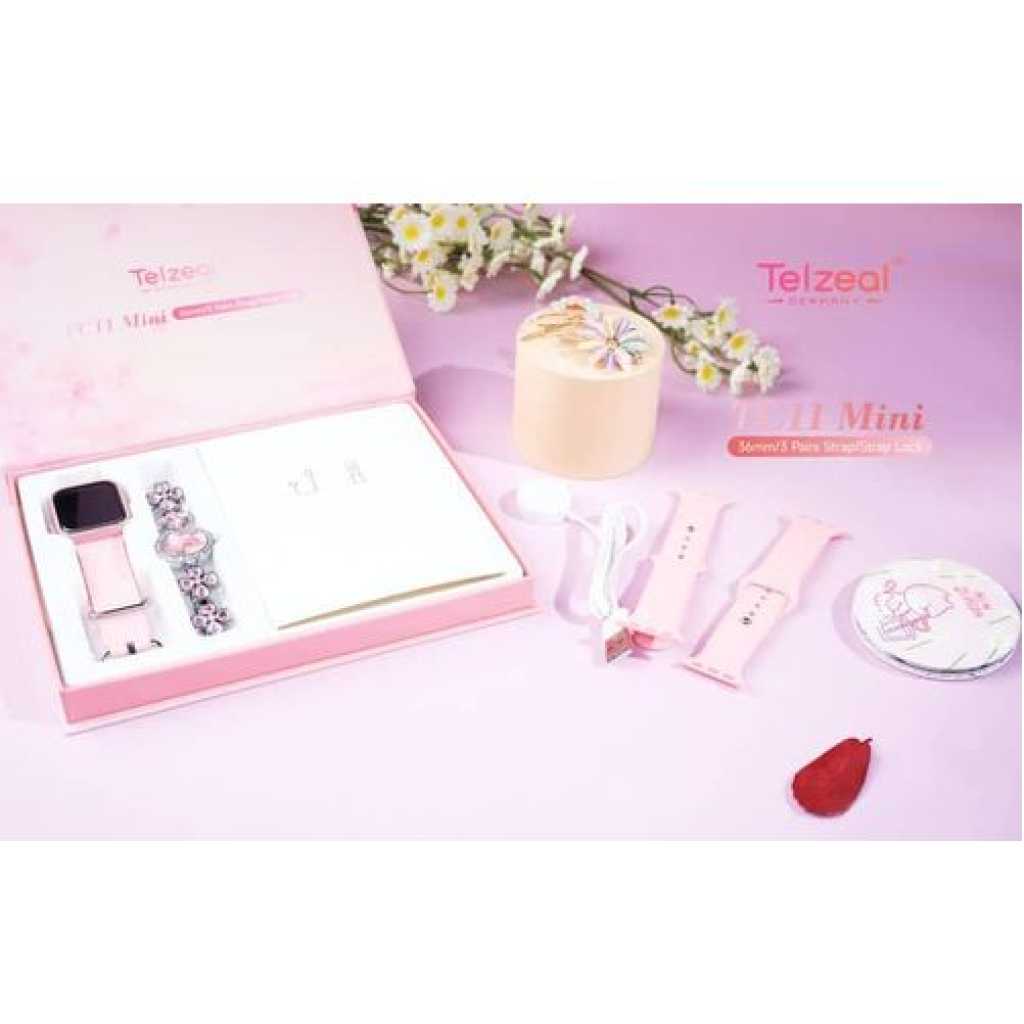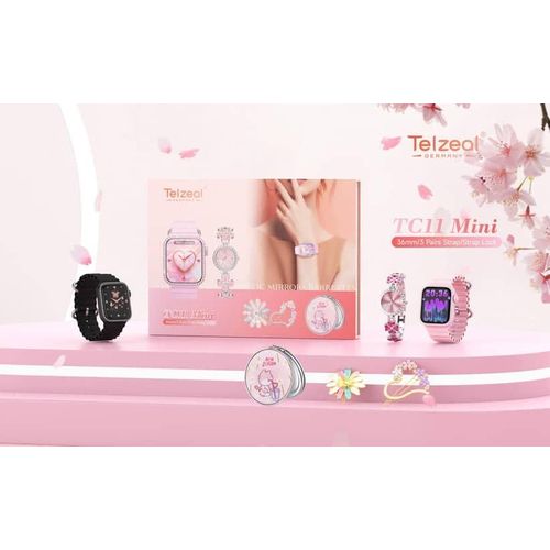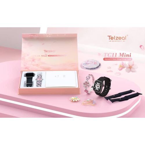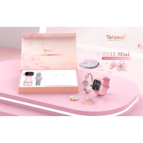 Key Features Colour Name Pink Department Women Connection Type Bluetooth Face/Dial Shape Square What’s In The Box Smart Watch, Analog Watch, Makeup Mirror, Hair Clip and Wireless Charger Smartwatch Dial Size 36 mm Features Bluetooth, Touchscreen, Heart Rate Monitor Model Number TC11 MINI Model Name TC 11 MIN Key Features: Compatible with Android and iOS Devices Multiple Watch Dial Faces Smart Notification will get in to your wrist 3 Pair Straps and Wireless Charger Bluetooth calling : you can not only receive call notifications on your smartwatch with calling feature but also attend them directly through the watch’s interface via a built-in speaker and a microphone