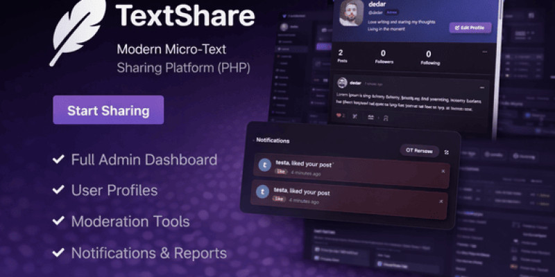 TextShare - Modern PHP Text Sharing Platform. A fast and modern PHP text sharing and micro-blogging platform with user profiles, admin panel and live notifications.