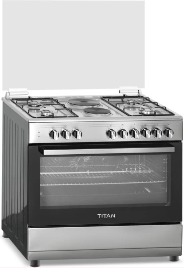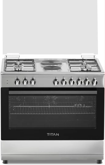 90cm wide cooker. H: 85cm, D: 60cm. 4 Gas burners with automatic electric ignition 2 Electric Hot plates Electric Oven Electric Grill & Rotiserrie Oven Fan Oven Lamp Timer Enamelled Pan Support 1-year warranty Titan TN-FC9420XBS 4 Gas + 2 Electric Plates Freestanding Cooker; For preparing delicious and aromatic home-cooked meals with this high-quality Cooker from Star Track . Made of Stainless Steel in a nice brushed finish that comes in with glass panels for a sleek and timeless This high-performance freestanding Gas Range features 4 Full-Safety Glass Top Lid, Push Button Ignition for HOBS & OVEN, that allow you to prepare multiple dishes at the same time. Can run on LPG and NG using a converter kit. Suitable for single or family-households, this semi-professional oven comes with a wired shelf, oven tray and Rotisserie to prepare delicious chicken and meat. High-Quality Design & Functionality semi-pro gas-cooker has been designed to meet high standards in the kitchen – also at home! 3 Full-Safety-Burners with Automatic Ignition, Push Button Knobs and Large Oven Cavities Glass Top Lid, Push Button Ignition for HOBS & OVEN Cast Iron Pan Support & Matt Enamel Burner Caps Double Glass Oven Door, Lamp, Rotisserrie, Turbo Fan Thermostat, 1 Oven Tray, 1 Oven Grid, Adjustable Feet. Hobs + Panel STAINLESS STEEL AUTOMATIC SAFETY GAS CUT-OFF FOR COMPLETE PEACE OF MIND This thermic flame safety device cuts off the gas supply when the burner fails to ignite or goes out. SecurGas devices are also integrated in the oven and grill burners with full safety. FAMILY SAFETY FIRST Our cast iron trivets flat design ensure the base of your pots and pans are fully supported, allowing you to have a safe and stable cooking environment. DETERGENT FREE SELF-CLEANING OVEN Catalytic enamel absorbs air when the oven is cold, and the catalyst in the enamel burns off soil when the oven heats up, meaning no detergents are required to clean the surface. PERFECT ROTISSERIE COOKING The specially designed automatic turnspit mechanisms ensure your meats and vegetables are browned and cooked to perfection, yet succulent and juicy inside.
