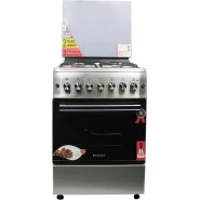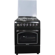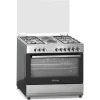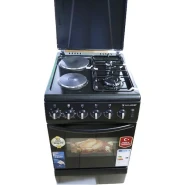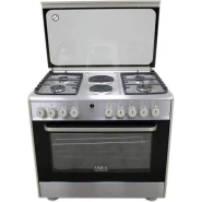 Key Features: 90cm wide cooker. H: 85cm, D: 60cm. 4 Gas burners with automatic electric ignition 2 Electric Hot plates Electric Oven Electric Grill & Rotiserrie Oven Fan Oven Lamp Timer Enamelled Pan Support 1-year warranty