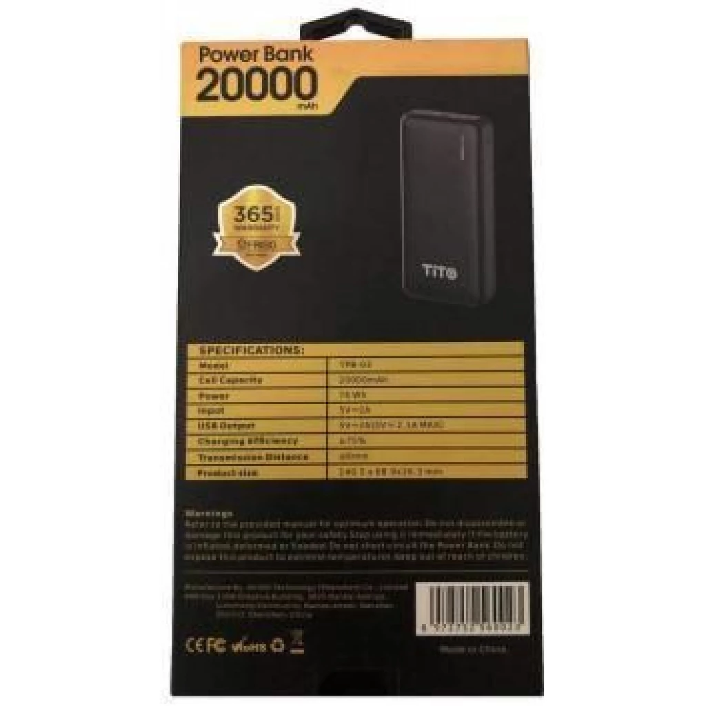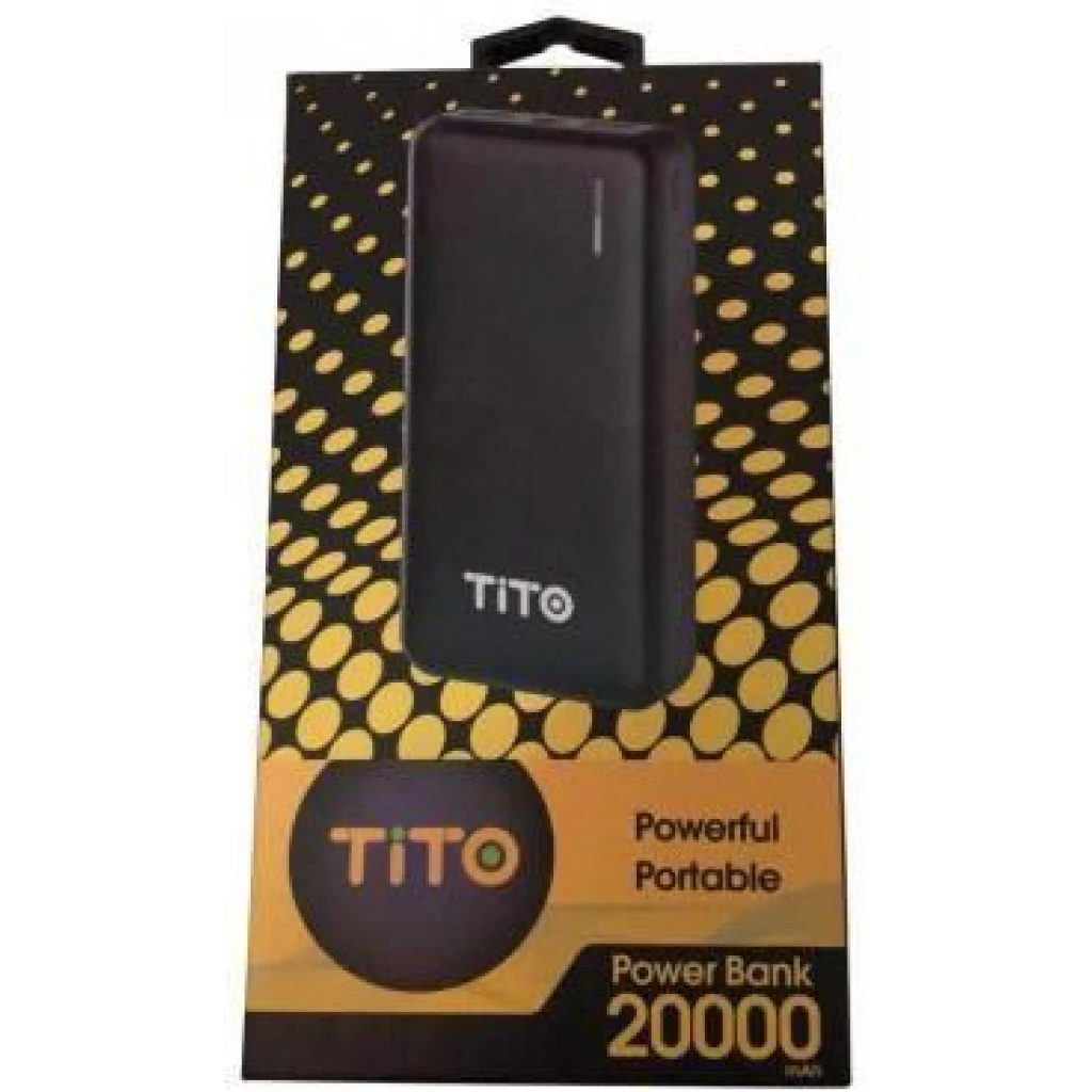 Key Features: Tito 20000mAh Powerful Portable Power Bank – Black Portable Powerful Type-C output Cell Capacity: 20000mAH Power: 74Wh