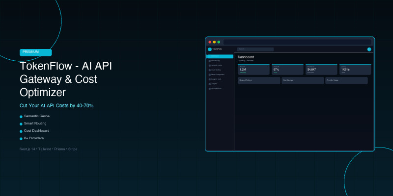 TokenFlow - AI API Gateway & Cost Optimizer. AI API Gateway: semantic caching, smart routing, prompt compression. 8+ providers, 40-70% cost savings. Next.js 14 + Stripe.