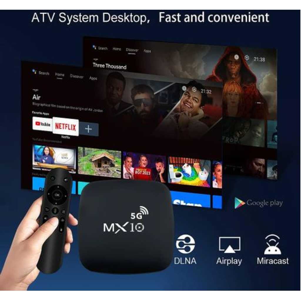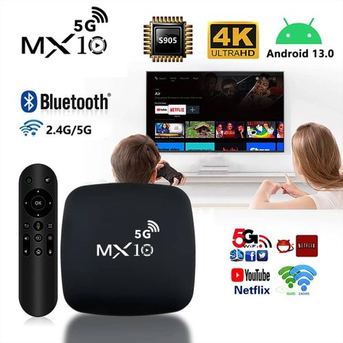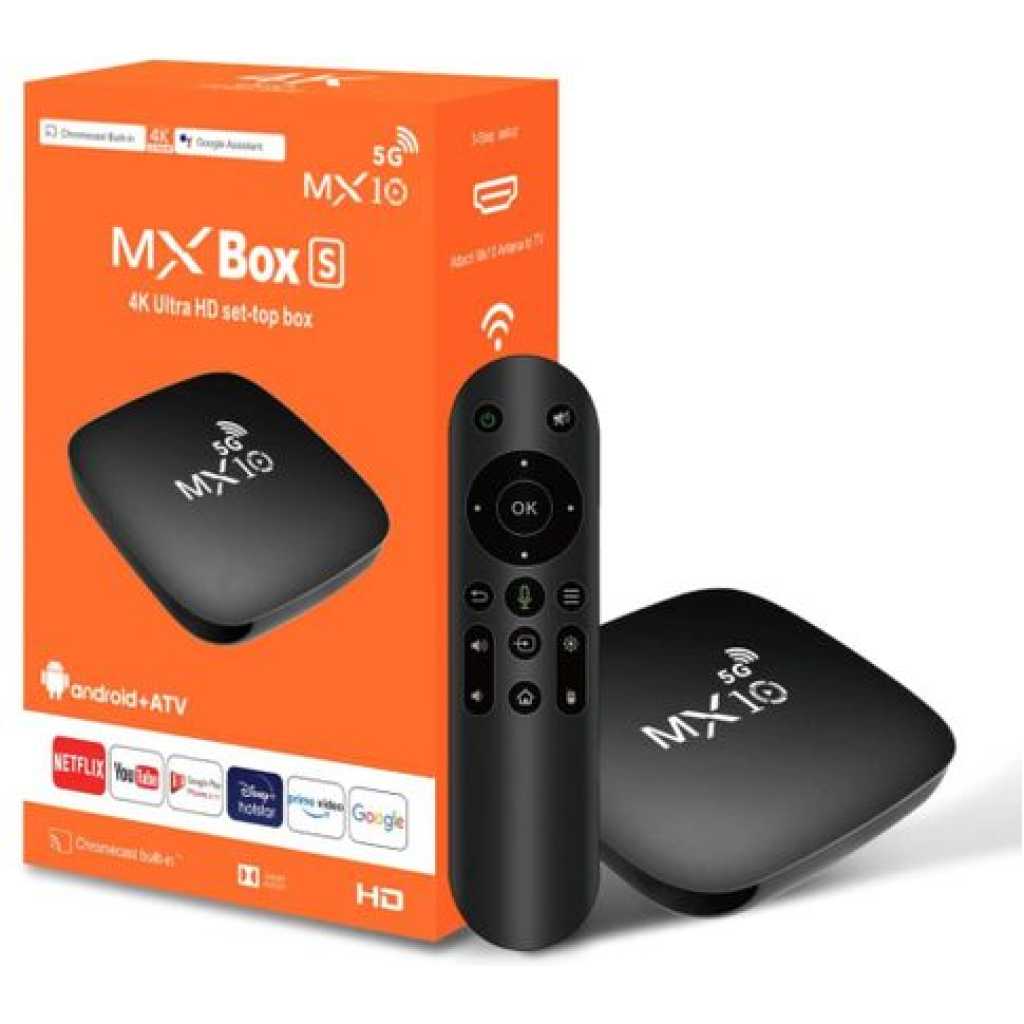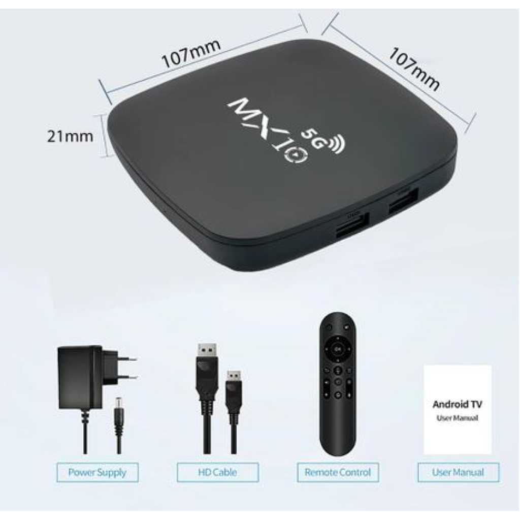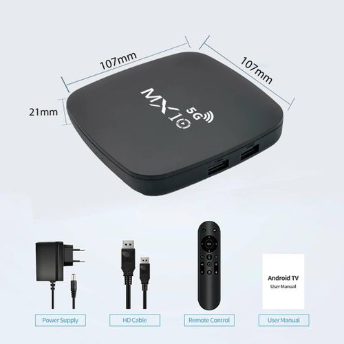 4K Ultra HD Image Quality: 4K Ultra HD realizes a more detailed and vivid image for you to immerse yourself in. 360° Bluetooth & IR Remote Control: The intuitive button layout and Bluetooth allows you to access your favorite content much quicker from any angle. Voice Control “Ok Google”: Your TV is more helpful than ever. Ask Google to find movies, stream apps, play music, and control the TV. Dolby Vision & HDR10+: A crisper image in any lighting condition. With Dolby Vision and HDR10+, images now feature a higher dynamic range, and have more amazing brightness, contrast and color than before. HDR images also have more detailed shadows and highlights. Dolby Atmos & DTS-HD: Extraordinary audio experience. As revolutionary spatial audio technology, Dolby Atmos brings the ultimate cinema experience into your living room by surrounding you with powerful sound effects, and also, DTS-HD delivers extraordinarily high-quality sound. Powerful Processor: Accelerated experience: The quad-core CPU delivers efficient performance. With high-performance GPU, the TV can now become your new entertainment platform. The 2GB RAM + 8GB ROM combo offers a smoother viewing experience. Google TV: Entertainment you love, with a little help from Google. Google TV brings together movies, shows, and more from across your apps and subscriptions and organizes them just for you. Discover new things to watch with recommendations based on what you watch and what interests you, from across your subscriptions and content available to you. MX10 Android TV Box is waiting for you with its rich contents and unique features to take your smart home entertainment systems to the next level. ; With this powerful TV box with Android 7.1 operating system, watch all kinds of multimedia content in 4K resolution, play your games on the big screen and make your television smarter with numerous applications. ; Android 7.1: Up-to-date and user-friendly operating system for a stable and fast experience; 4k resolution: Watch your movies and videos in crystal clarity with cinema-quality images; Easy installation: It is easy and fast to install with the plug and play feature; Multi-purpose use: It offers Android TV, TV box, box, TV stick and smart TV features all in one; Maximize entertainment: Bring your favorite movies, TV series and live broadcasts directly to the comfort of your living room; Gaming enjoyment: Increase your experience by playing games on a larger screen; Application support: Download and use the applications you want; Smart control: Control your TV box with your remote control or your smartphone; High connection options: Experience the best connection with HDMI, USB ports and Wi-Fi connection. What’s in the box 1 x 4K Android Wifi Smart TV Box 1 x Connect Cable 1 x Charger Cable 1 x Remote 1 x Manual