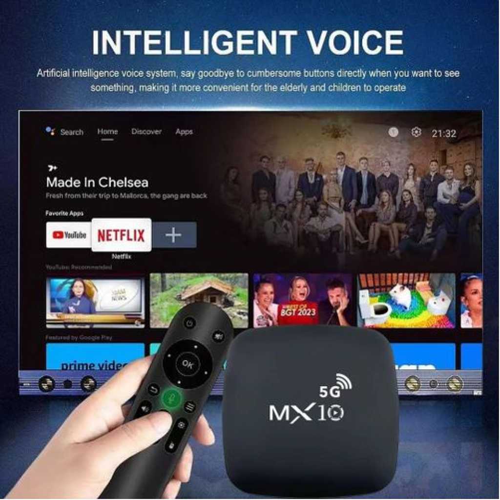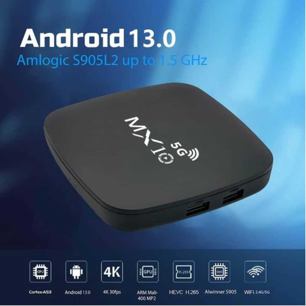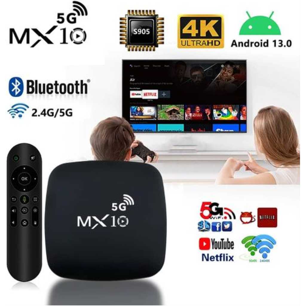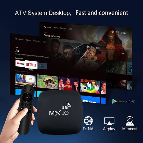 4K Ultra HD Image Quality: 4K Ultra HD realizes a more detailed and vivid image for you to immerse yourself in. 360° Bluetooth & IR Remote Control: The intuitive button layout and Bluetooth allows you to access your favorite content much quicker from any angle. Voice Control “Ok Google”: Your TV is more helpful than ever. Ask Google to find movies, stream apps, play music, and control the TV. Dolby Vision & HDR10+: A crisper image in any lighting condition. With Dolby Vision and HDR10+, images now feature a higher dynamic range, and have more amazing brightness, contrast and color than before. HDR images also have more detailed shadows and highlights. Dolby Atmos & DTS-HD: Extraordinary audio experience. As revolutionary spatial audio technology, Dolby Atmos brings the ultimate cinema experience into your living room by surrounding you with powerful sound effects, and also, DTS-HD delivers extraordinarily high-quality sound. Powerful Processor: Accelerated experience: The quad-core CPU delivers efficient performance. With high-performance GPU, the TV can now become your new entertainment platform. The 2GB RAM + 8GB ROM combo offers a smoother viewing experience. Google TV: Entertainment you love, with a little help from Google. Google TV brings together movies, shows, and more from across your apps and subscriptions and organizes them just for you. Discover new things to watch with recommendations based on what you watch and what interests you, from across your subscriptions and content available to you. MX10 Android TV Box is waiting for you with its rich contents and unique features to take your smart home entertainment systems to the next level. ; With this powerful TV box with Android 7.1 operating system, watch all kinds of multimedia content in 4K resolution, play your games on the big screen and make your television smarter with numerous applications. ; Android 7.1: Up-to-date and user-friendly operating system for a stable and fast experience; 4k resolution: Watch your movies and videos in crystal clarity with cinema-quality images; Easy installation: It is easy and fast to install with the plug and play feature; Multi-purpose use: It offers Android TV, TV box, box, TV stick and smart TV features all in one; Maximize entertainment: Bring your favorite movies, TV series and live broadcasts directly to the comfort of your living room; Gaming enjoyment: Increase your experience by playing games on a larger screen; Application support: Download and use the applications you want; Smart control: Control your TV box with your remote control or your smartphone; High connection options: Experience the best connection with HDMI, USB ports and Wi-Fi connection. What’s in the box 1 x 4K Android Wifi Smart TV Box 1 x Connect Cable 1 x Charger Cable 1 x Remote 1 x Manual
