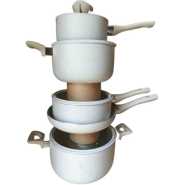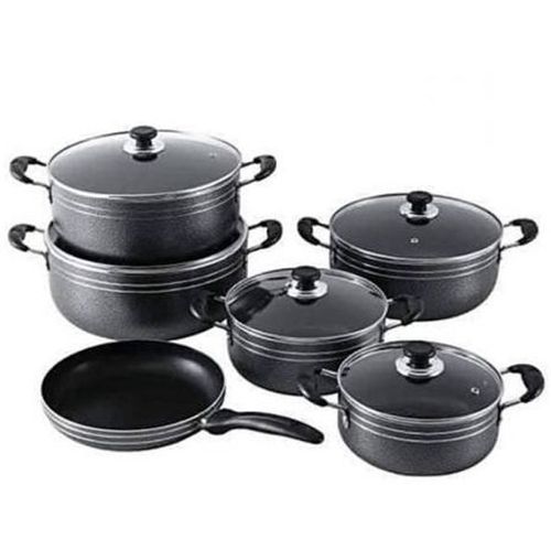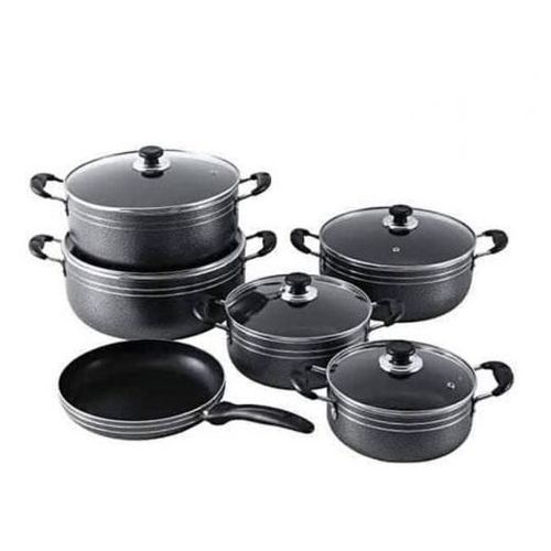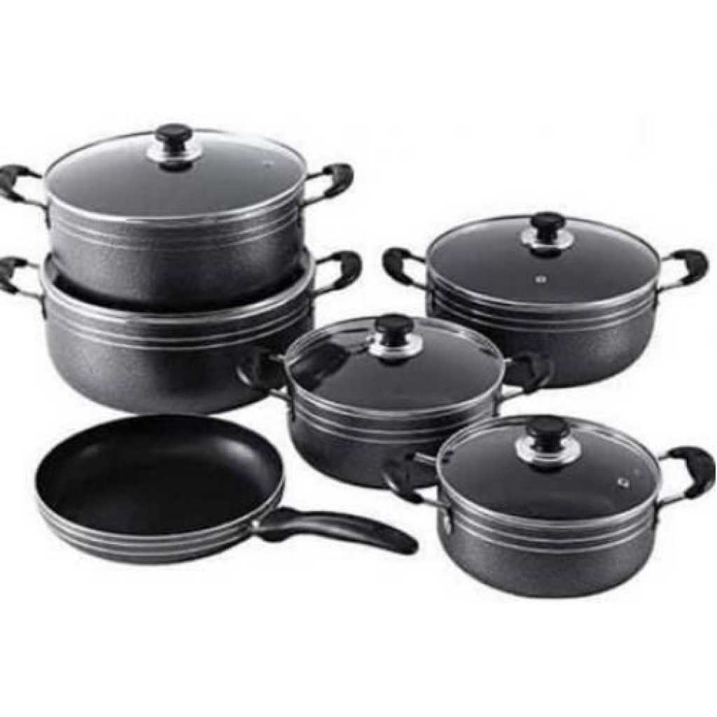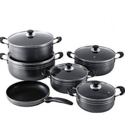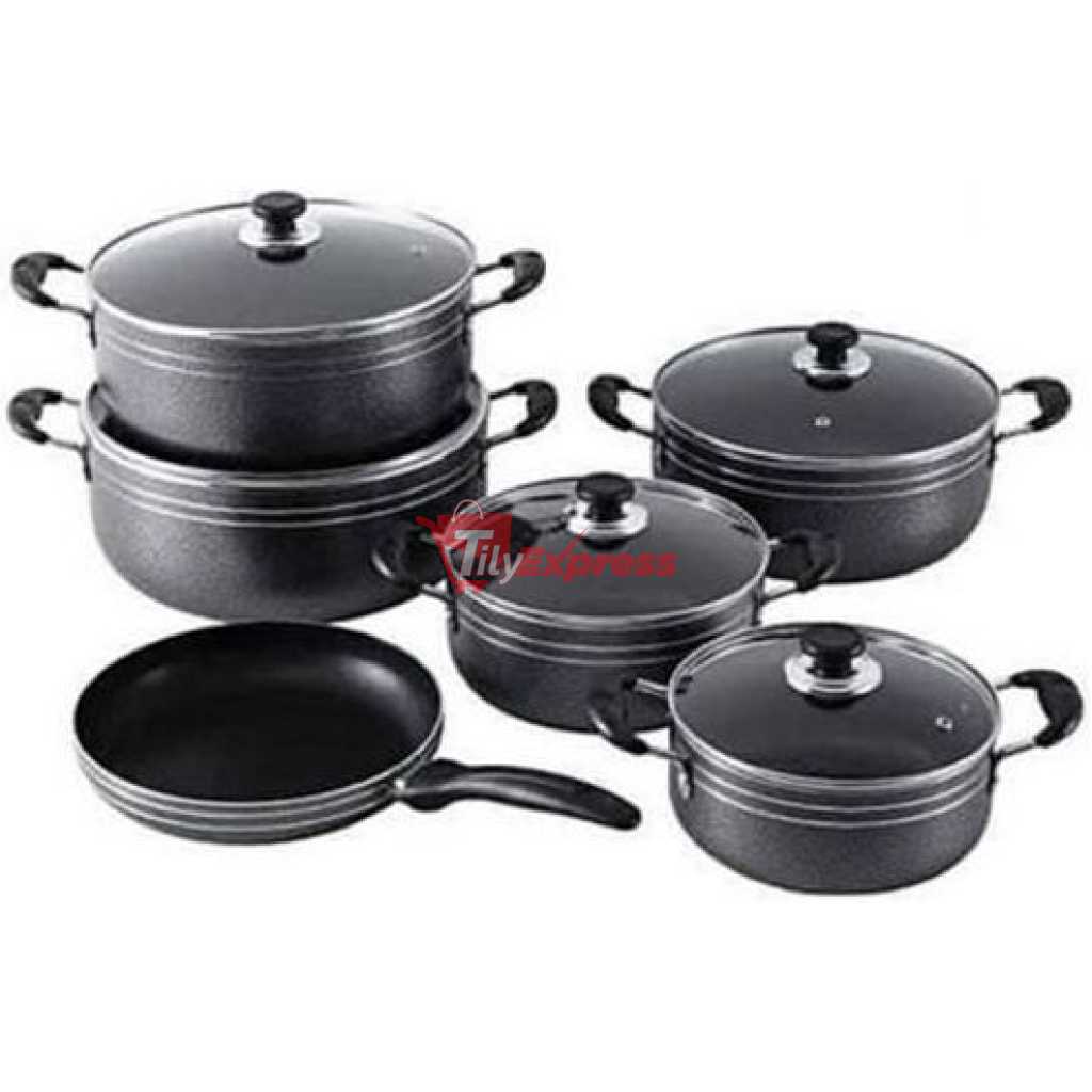 Tornado Aluminum Cookware Set of 5 Pots And 1 Frying pan -Black This is the world’s favorite non -stick coating aluminum Cookware set. It is long-lasting and high performance beyond expectations, the pots are all of higher quality standards at a better superior cooking performance. The set has five hard aluminum cooking pots of different sizes starting from 30cm, 28cm,24cm, 22cm, and 20cm, In addition to that, there is a 26cm non-stick frying pan of the same quality as the pots. This is the best every home deserves.