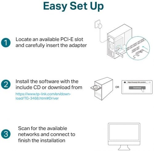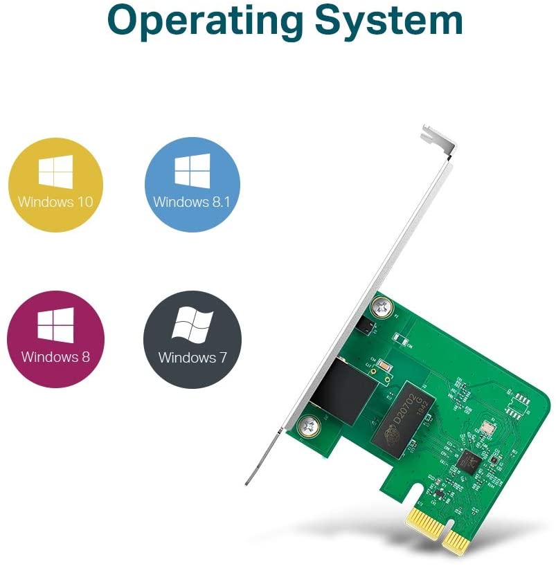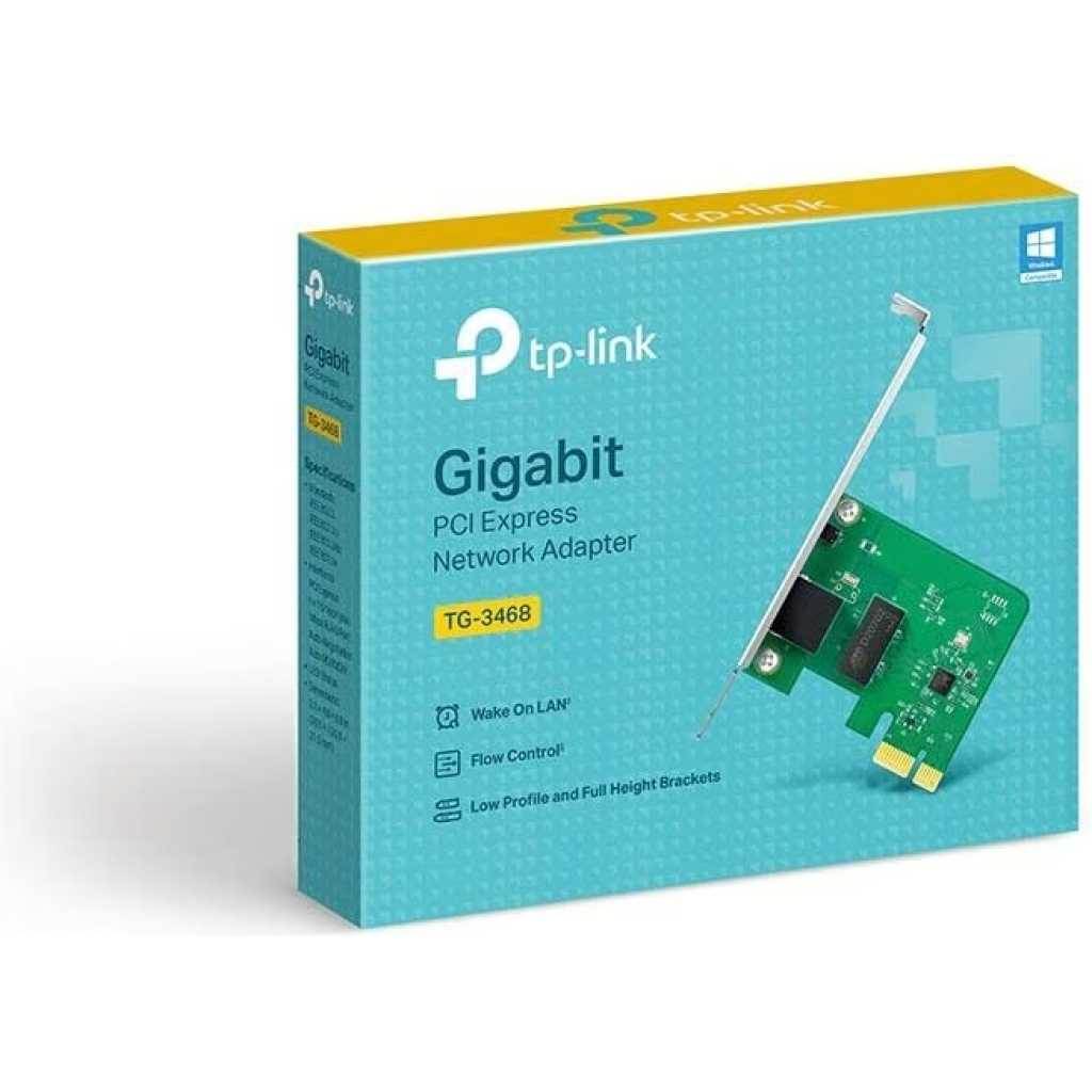 TP-Link 10/100/1000Mbps Gigabit Ethernet PCI Express Network Card (TG-3468), PCIE Network Adapter, Network Card, Ethernet Card for PC, Win10 supported What This Product Does The 32-Bit Gigabit PCI Express Network Adapter TG-3468 allows you to connect a desktop computer to a high-speed wired network. It is a highly integrated and cost-effective Gigabit Ethernet Adapter, and a good choice to upgrade your network. Key Features Support 10/100/1000Mbps throughput Support Wake-on-LAN Auto-Negotiation and Auto MDI/MDIX Support IEEE 802.3x Flow Control for Full-duplex Mode and backpressure for Half-duplex Mode Support IEEE 802.1p Layer 2 Priority Encoding and IEEE802.1q VLAN tagging Support power down/link down power saving Support Windows XP 32/64bit, Vista 32/64bit, Windows 7 32/64bit, Windows 8 32/64bit Package Contents PCI Express Adapter TG-3468 Low-profile Bracket Quick Installation Guide Resource CD Key Features: PCI Express Adapter TG-3468 Low-profile Bracket Quick Installation Guide Resource CD Brand TP-Link Hardware Interface Ethernet Operating System Windows XP 32/64bit, Vista 32/64bit, Windows 7 32/64bit, Windows 8 32/64bit
