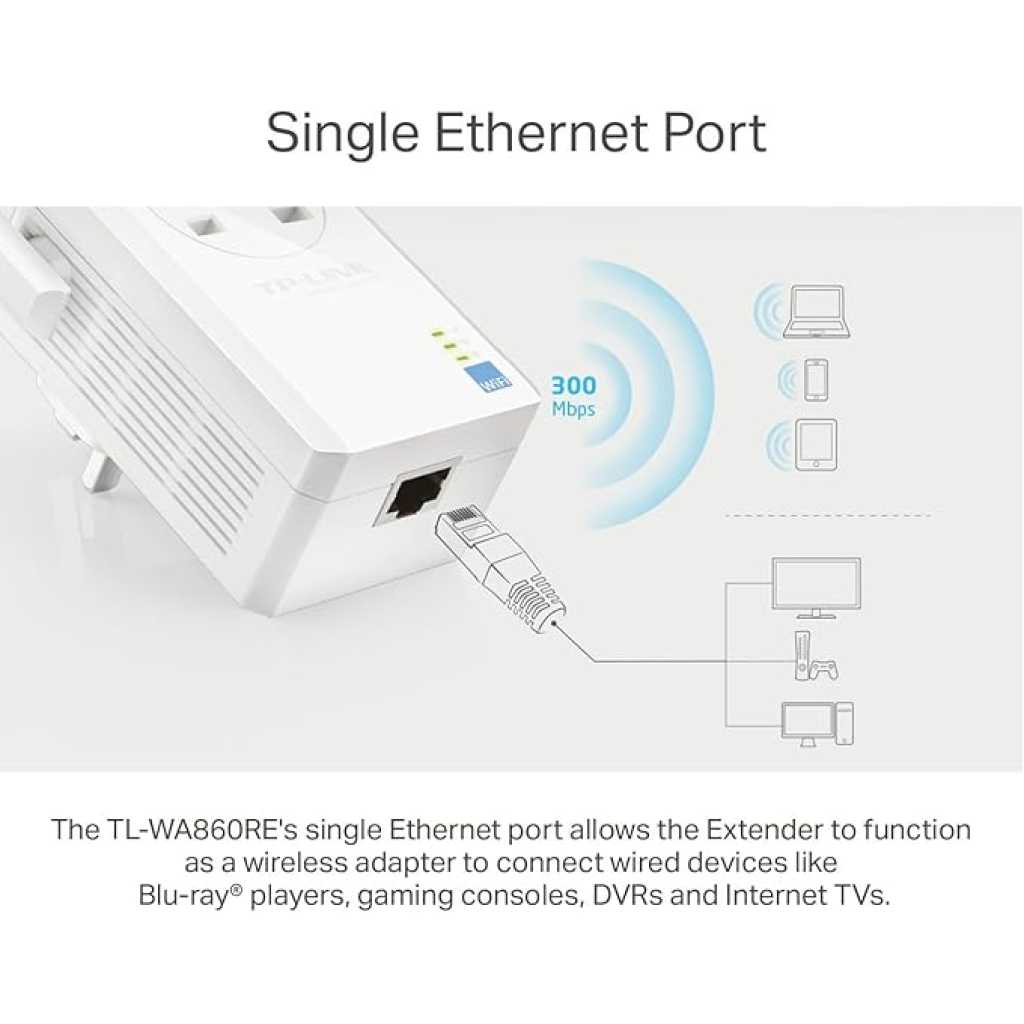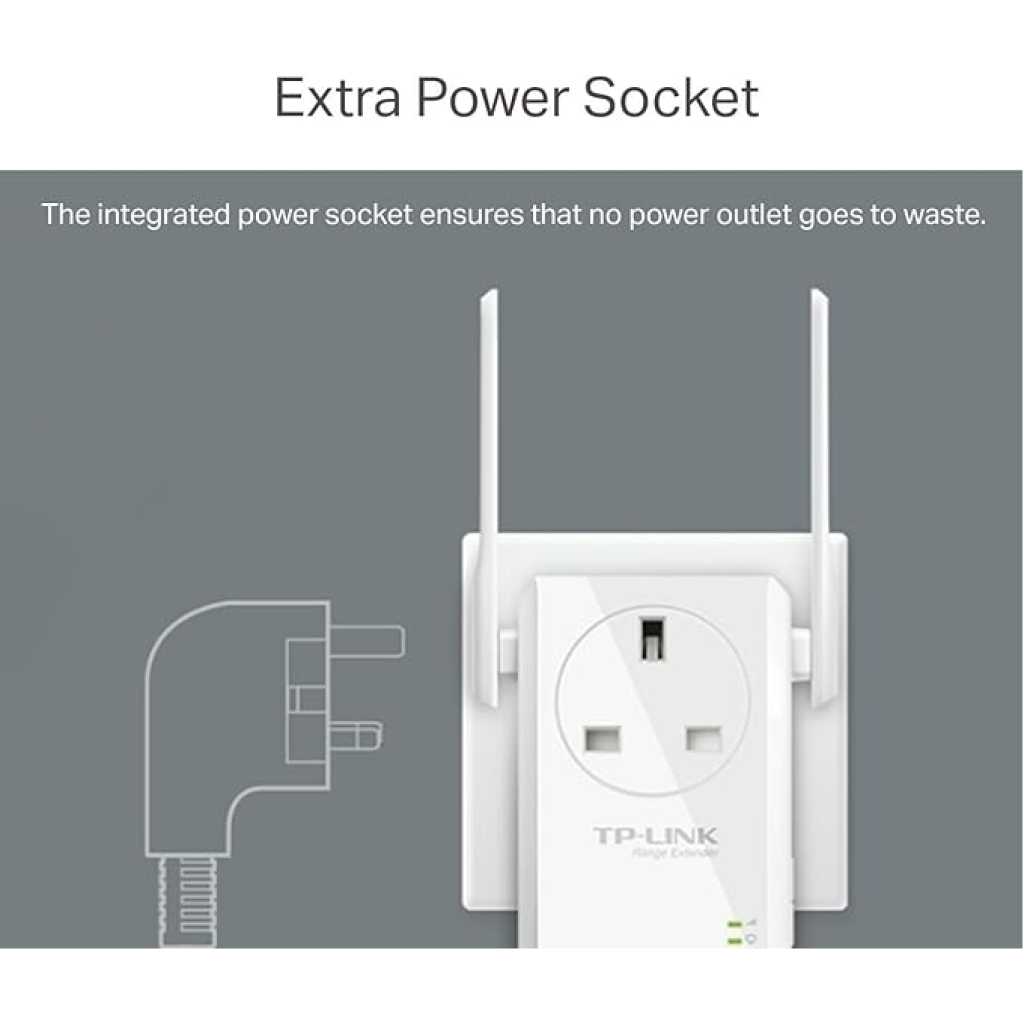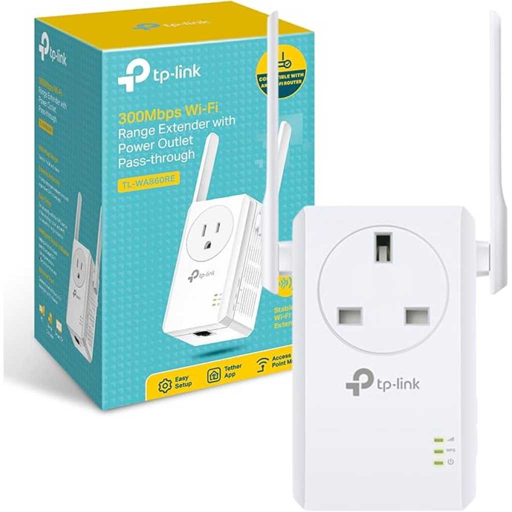 TP-Link TL-WA860RE WiFi Extender Booster with Passthrough Socket, Ethernet Port N300Mbps, Internet Booster, WiFi Repeater,WiFi Extender,App Control, WiFi Booster Range Extender, Plug and Play,UK Plug Range Extender mode boosts wireless signal to previously unreachable or hard-to-wire areas flawlessly Miniature size and wall-mounted design make it easy to deploy and move flexibly Extra power socket making sure that no power outlet is going to waste. Transmit power < 20 dBm (EIRP) 2 fixed external antennas provide excellent WiFi coverage and reliability Easily expand wireless coverage at a push of Range Extender button Note Please place the range extender half way across the router where you get at least 50-60% of good Wi-Fi coverage from your main router. Customer can also factory reset the range extender and configure it back again to the router, making sure it is configured properly with a different SSID compared to main router. Try changing the Wireless channel on router which will help in signal dropouts. Also make sure the range extenders firmware is up to date. Place the Range extender at an elevated position for best Wi-Fi reception and also if the RE is equipped with antennas, they should be positioned properly.
