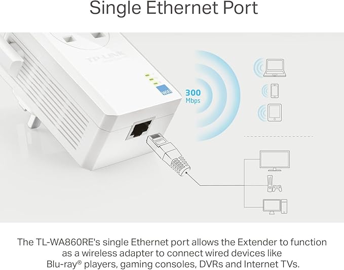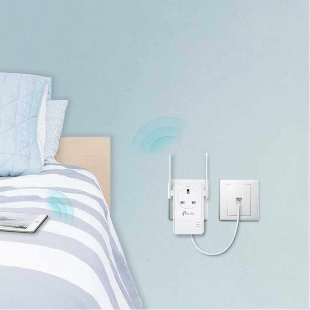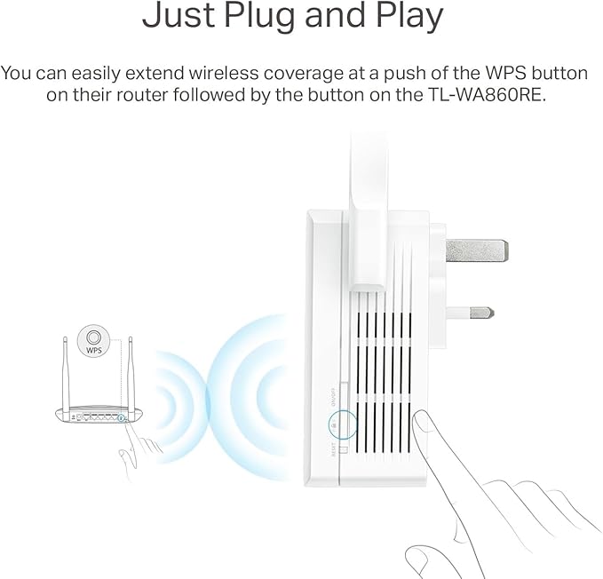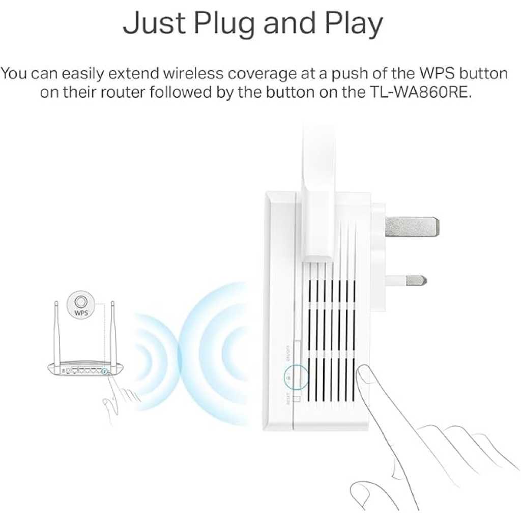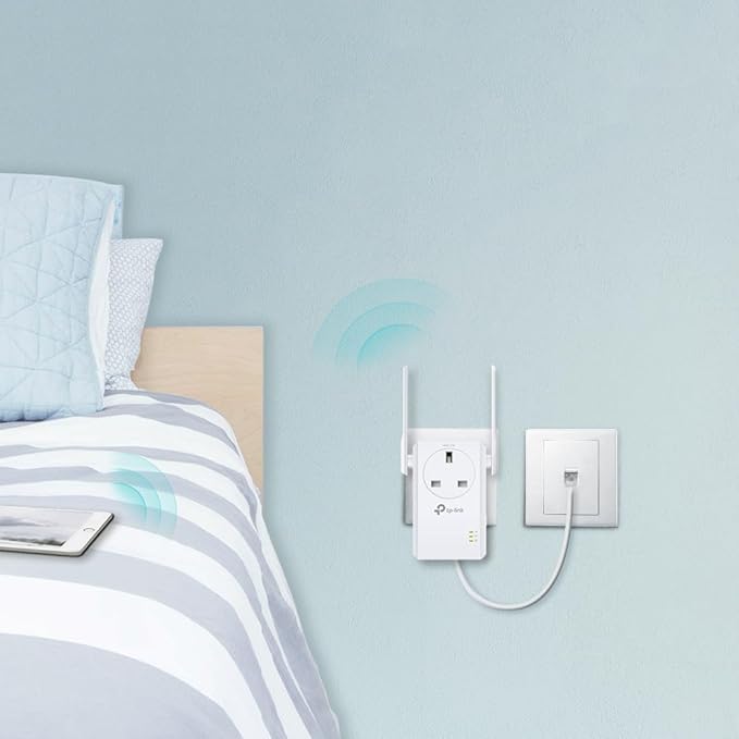 TP-Link TL-WA860RE WiFi Extender Booster with Passthrough Socket, Ethernet Port N300Mbps, Internet Booster, WiFi Repeater,WiFi Extender,App Control, WiFi Booster Range Extender, Plug and Play,UK Plug Range Extender mode boosts wireless signal to previously unreachable or hard-to-wire areas flawlessly Miniature size and wall-mounted design make it easy to deploy and move flexibly Extra power socket making sure that no power outlet is going to waste. Transmit power < 20 dBm (EIRP) 2 fixed external antennas provide excellent WiFi coverage and reliability Easily expand wireless coverage at a push of Range Extender button Note Please place the range extender half way across the router where you get at least 50-60% of good Wi-Fi coverage from your main router. Customer can also factory reset the range extender and configure it back again to the router, making sure it is configured properly with a different SSID compared to main router. Try changing the Wireless channel on router which will help in signal dropouts. Also make sure the range extenders firmware is up to date. Place the Range extender at an elevated position for best Wi-Fi reception and also if the RE is equipped with antennas, they should be positioned properly.