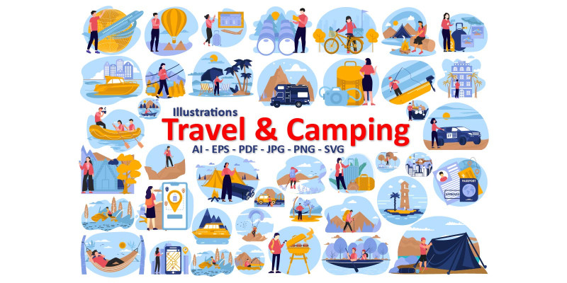 Travel And Camping Illustrations. Travel & Camping combine adventure and nature, offering a perfect escape from daily life. Explore scenic landscapes, camp unde