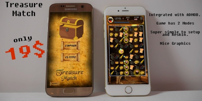 Treasure Match - Unity Source Code with ADMOB. 4 for 1 price!!! Treasure Match is like Candy Crush Saga kind of game.