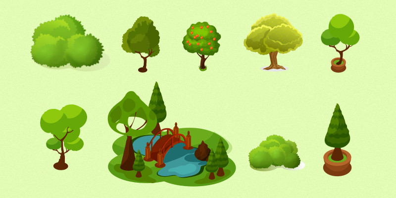 Trees Environment Props Pack. Reusable 2D tree environment props for casual and mobile games, ideal for backgrounds, scenes, and level decoration.
