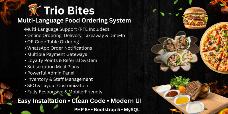 Trio Bites – Online Food Ordering System. PHP food ordering system with admin panel, QR ordering, WhatsApp alerts, multiple payments, and multi-language support.