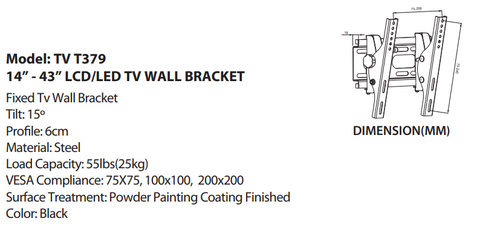 Suitable for most 14”-43” flat panel LCD & LED Televisions Additional Information Colour Black Loading Capacity 25 Kg Size 14″ – 43″ Tilt 15° Warranty 1 Year Additional Suitable for most 14”-43” flat panel LCD & LED Televisions Application Living room and Bedroom
