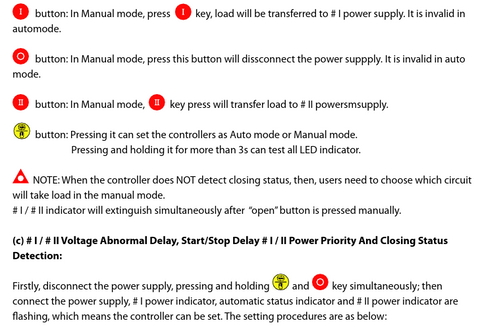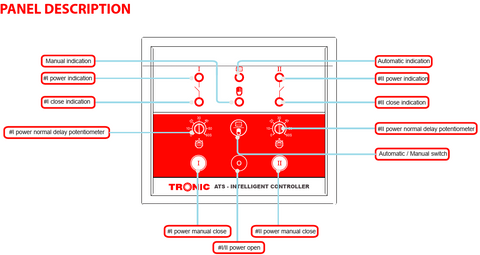TRONIC Automatic Transfer Switch (ATS) controller uses microprocessor as its core which can precisely monitor voltage (loss of main power). The ATS will start functioning in the following circumstances; loss of power, over voltage, under voltage phase. Additional Information Colour White Amps 150A Voltage AC 230V ± 30% Material Aluminium Additional Information DC power supply: DC(8-35)V between VIN and GND Measured voltage: Rated line voltage 400V; 50Hz/60Hz: 3 phase 4 wire. Range of abnormal power Over voltage threshold: 240~290, 5V. Default: 264 5V. Under voltage threshold: 164~198V, 5V. Default: 172 5V Voltage normal delay: (1~60) seconds. Voltage abnormal delay: (1~60) seconds, default: 5 seconds. Genset start delay: Issued at a default of 5 seconds. Genset start delay: Is set at default 60 seconds. Envoirment conditions: Working Temperature: (-30~+70) C. Humidity: (20~95)%RH. Warranty 1 Year Key Features: TRONIC Automatic Transfer Switch (ATS) controller uses microprocessor as its core which can precisely monitor voltage (loss of main power). The ATS will start functioning in the following circumstances; loss of power, over voltage, under voltage phase.