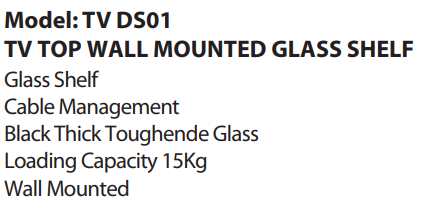Additional Information Colour Black Loading Capacity 15 Kg Warranty 1 Year Application Living room and Bedroom Key Features: Tronic TV Top Wall Mounted Glass Shelf