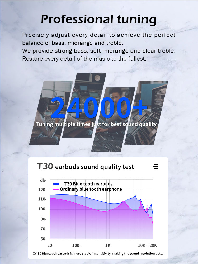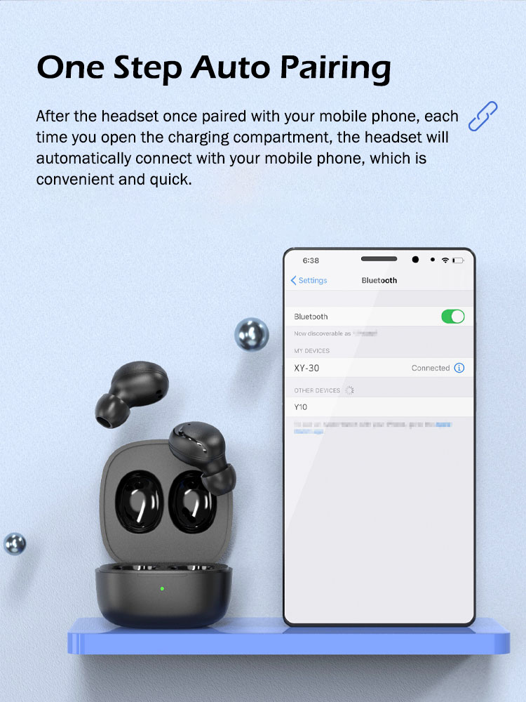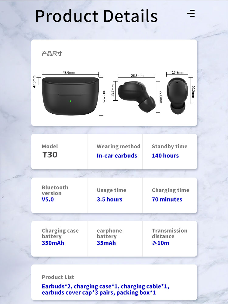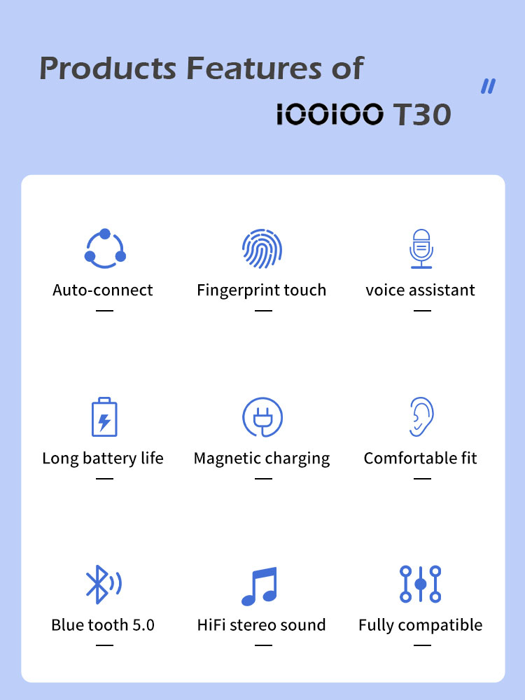 T30 Ture Wireless Stereo Bluetooth Headset Description: [Smart Touch Control] Specific touch control function makes it more convenient, tap once to play/pause music and answer calls, double tap to skip forward/backward, hold to adjust the volume. You can easily control it without operating the phone. [BLUETOOTH 5. 0] Adopt the advanced Bluetooth 5. 0 technology. IOOIOO T30 Support HSP, HFP, A2DP, AVRCP, which greatly improve the transmission speed and providing you with a low-latency listening experience. [One-step pairing] After the headset once paired with your mobile phone, each time you open the charging compartment, the headset will automatically connect with your mobile phone, which is convenient and quick. [Ceramic antenna] Bluetooth headset uses ceramic antenna with stable signal and low interference. [IPX4 Waterproof] The inner nano-coating of earplugs and charging case can prevent splashing sweat and rain. Suitable for sports and prevent water ingress. [Low-power battery solution] The charging compartment has a built-in lithium battery, which is light in weight, and the headset has an automatic sleep function which is lower power consumption. [Charge on the go] Playtime lasts for over 3 hours from single charge and total 30 hours with charging case. Enjoy fast charging, to fully charge the rechargerable case only 70 minutes via cable. Providing convenient charging way with no strings attached. Trouble Shooting: 1. Why my headset can’t turn on right after receiving it?​ Answer: After a long period of transportation, the battery of the headset may be exhausted on the way. Please charge the headset and the charging compartment as soon as you receive the headset to ensure subsequent normal use. 2. Why my headsets can’t be charged? Answer: Substandard chargers may damage the headset battery. Please make sure to use a 5V 1A charger to charge the headset. 3. Why my headset can’t be paired? Answer: Excessive surrounding Wifi or Bluetooth signals will interfere with the Bluetooth of the headset. Please try to turn off the Bluetooth or wifi signals of other devices and then turn on the headset for pairing. Key Features: Smart touch control Bluetooth 5.0 One-step pairing Ceramic antenna IPX4 waterproof Low-power battery solution Charge on the go