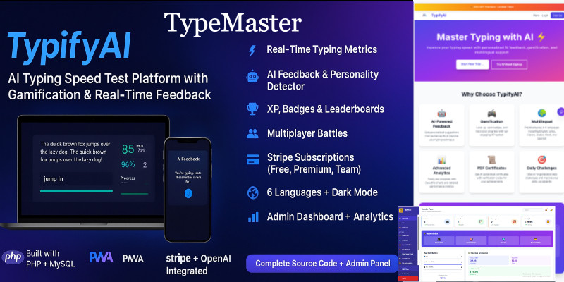 TypeMaster - Online Typing Speed Test PHP Script. AI-powered typing test platform with real-time feedback, gamification, multiplayer, analytics, and Stripe integration.