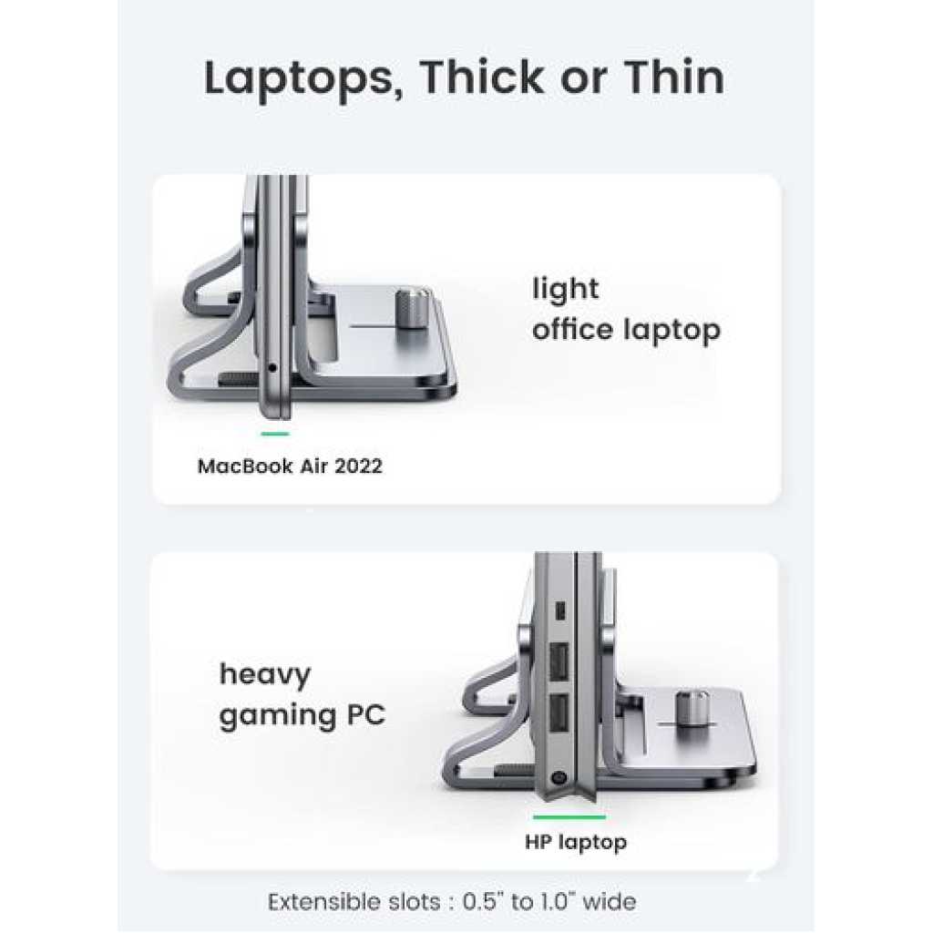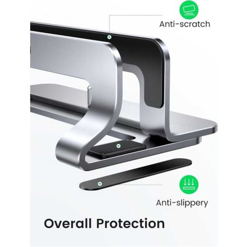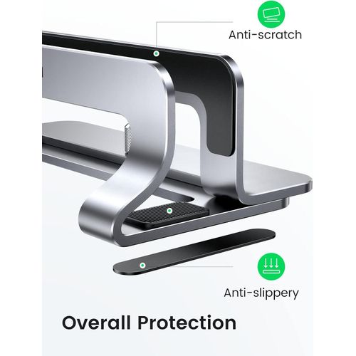 Key Features: Space-Saving Design: UGREEN vertical laptop stand takes less desk space significantly compared to laying your laptop flat. It effectively maximizes your desk area for other tasks by holding your laptop vertically for storage. A great tool for storing your laptop when you’re using a monitor or keyboard. Sturdy & Stable: Made of premium aluminum alloy, this vertical laptop stand for desk ensures great stability for holding your laptop, super sturdy and no wobble at all. It provides a stable base for laptop, allowing you to place it at a stable position on desk or table without worrying its safety. Adjustable Width: This laptop holder stand has an extensible slot, which fits most laptops with the thickness ranging from 0.5″ to 1″. Simply twist the screw, this vertical laptop stand is compatible with MacBook Air, MacBook Pro, Microsoft surface, Samsung Galaxy Book, Lenovo Ideapad 3, HP Notebook, Dell Chromebook, ThinkPad and other computers up to 17.3 inches. Anti-Slip & Anti-Scratch: The desk laptop stand holder is covered with non-slip silicone pads inside the slot, perfectly protecting your PC from scratches. The base is also covered with silicone pads to avoid slipping or sliding. Easy to Carry: With portable size of 5.9″ by 3.2″ by 2″, this laptop desk holder adds a stylish and organized look to your workspace, suitable for professionals working on the go frequently