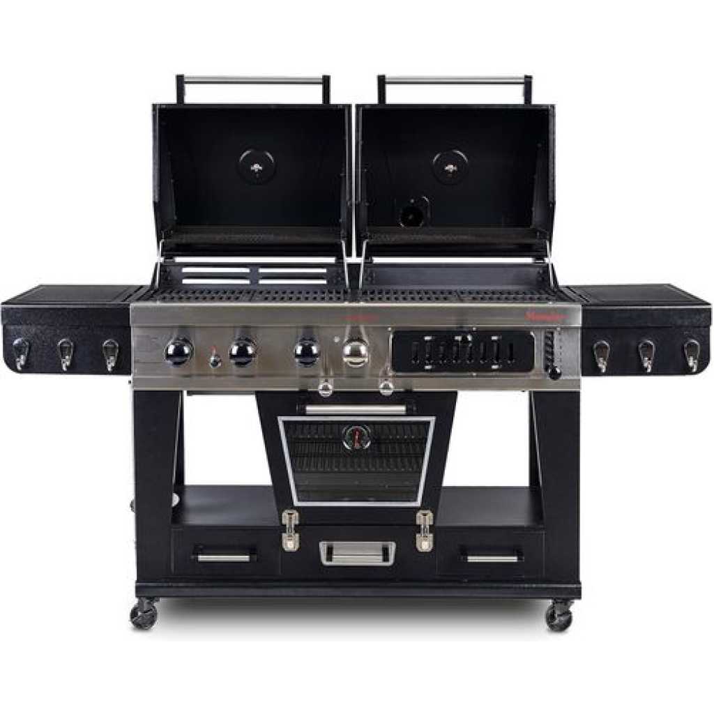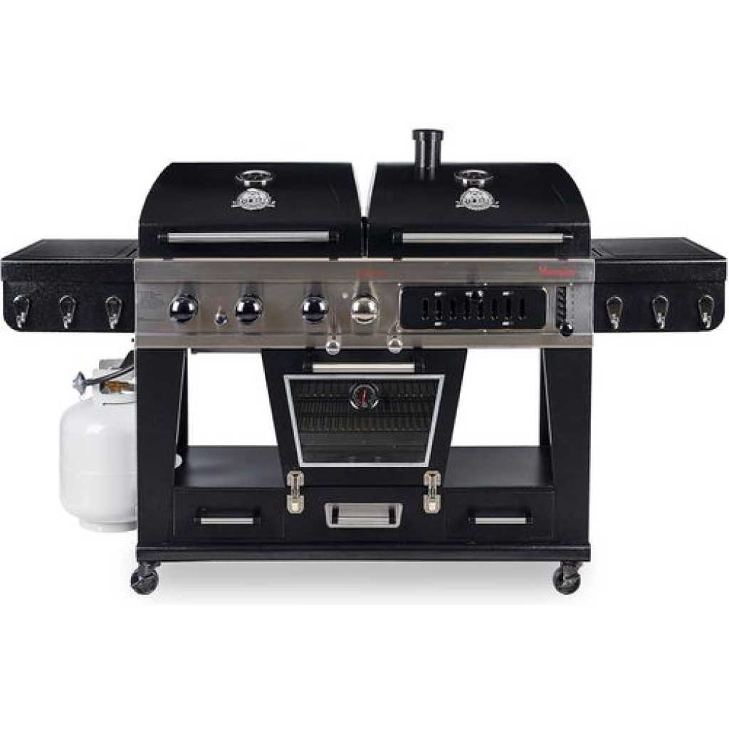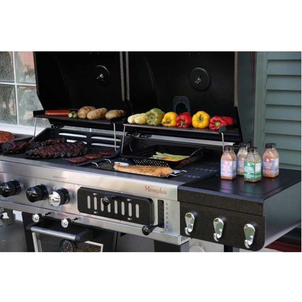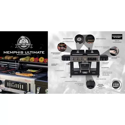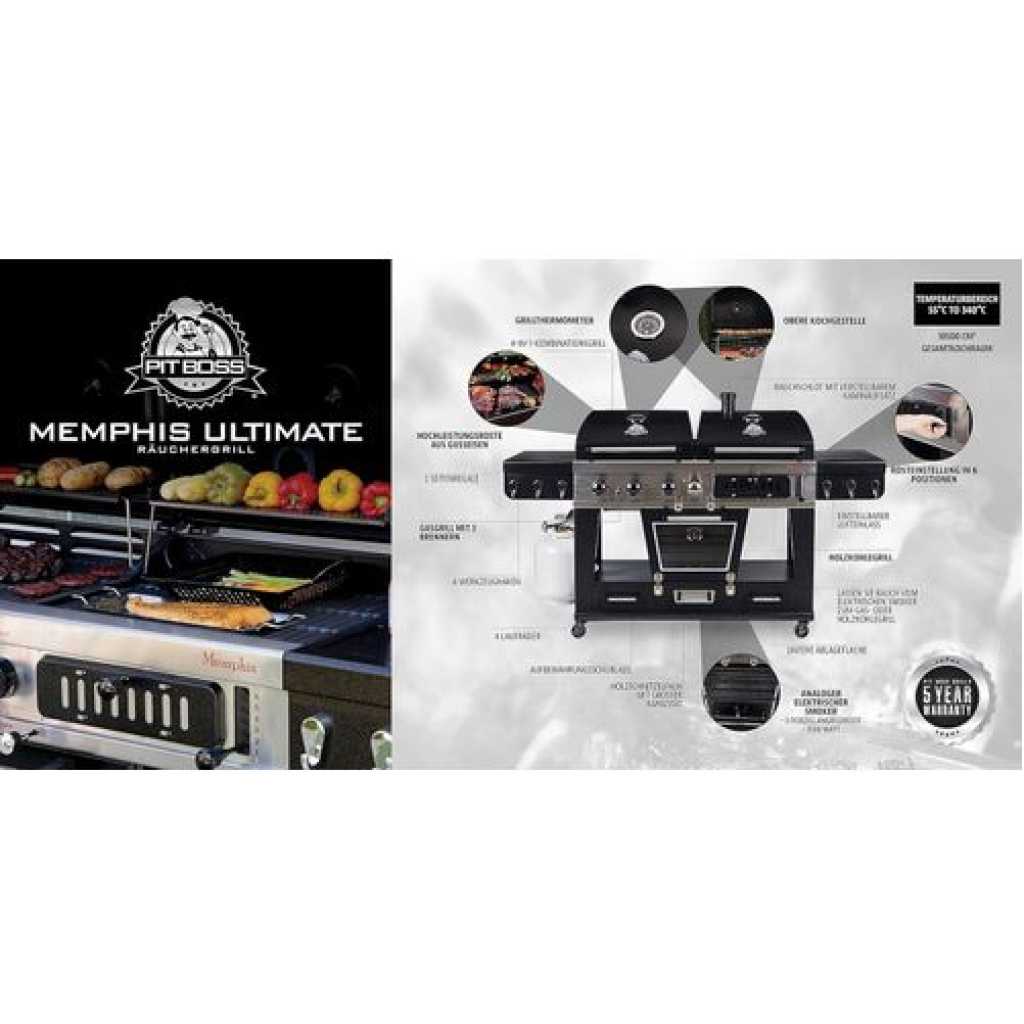 Your wildest barbecuing dreams have come true. Introducing the Pit Boss Memphis Ultimate – the pinnacle of outdoor cooking. The first of its kind, the Memphis Ultimate is the combination of a gas barbecue, a charcoal barbecue, and a glass doored electric smoker, totaling over 20cm2 of cooking space. Char-grill burgers or barbecue kebabs on your 36,000 BTU 3-burner gas grill. Grill your favorite meats on your charcoal grill, with a 6-position grade adjustment, front air intake and rear chimney exhaust. The ingenious engineering of the Memphis Ultimate allows you to offset the smoke from the smoker into either grill side, for a delicious added smoke flavor to anything you cook. If that weren’t enough, the Memphis Ultimate also comes equipped with 2 drawer storage, tool hooks, a side shelf for preparation, and locking caster wheels for mobility Total cooking area: 1,850 sq in 3 stainless steel burners; 36,000-BTU LP gas grill Charcoal grill with adjustable charcoal grate and air dampers Lower electric analog smoker with front-access wood pan Porcelain-coated cast iron grilling surface Porcelain-coated warming racks Adjustable vents allow smoke to fill LP or charcoal chamber for offset smoking or cold smoking 1,500-watt electric smoker element Pit Boss Memphis Ultimate Smoking Grill with 4 Casters Can be used as a liquid gas grill, a charcoal grill, a smoker or indirect cooking 4-in-1 smoker for the full BBQ experiencea Key Features: Total cooking area: 1,850 sq in 3 stainless steel burners; 36,000-BTU LP gas grill Charcoal grill with adjustable charcoal grate and air dampers Lower electric analog smoker with front-access wood pan Porcelain-coated cast iron grilling surface Porcelain-coated warming racks Adjustable vents allow smoke to fill LP or charcoal chamber for offset smoking or cold smoking 1,500-watt electric smoker element Pit Boss Memphis Ultimate Smoking Grill with 4 Casters Can be used as a liquid gas grill, a charcoal grill, a smoker or indirect cooking 4-in-1 smoker for the full BBQ experience
