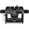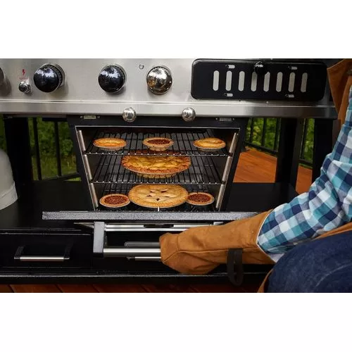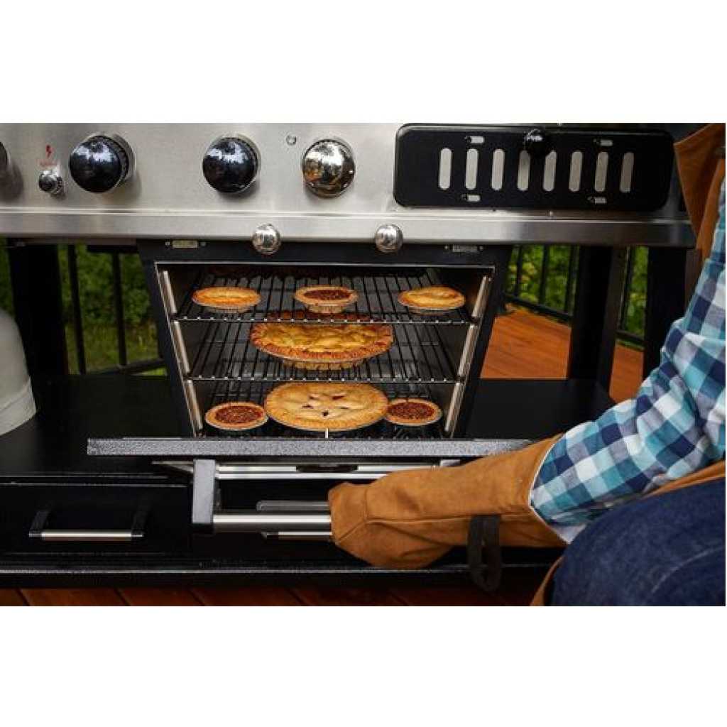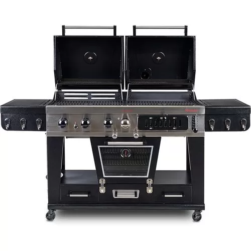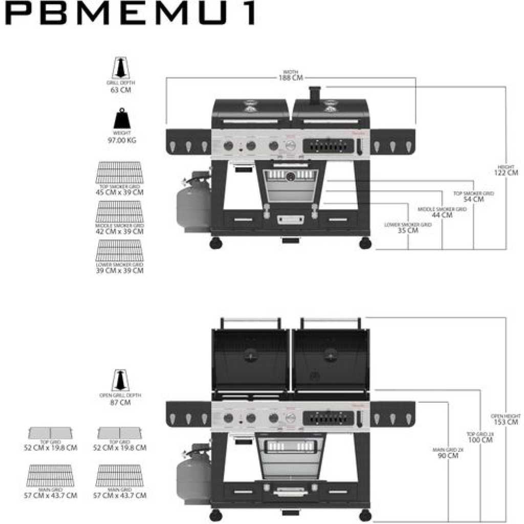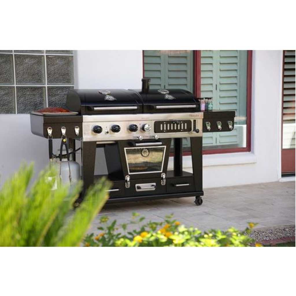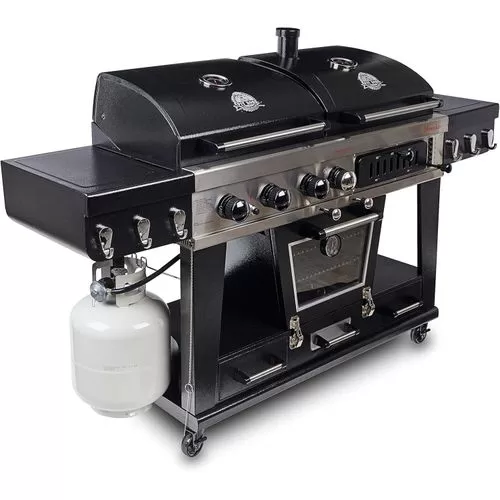 Your wildest barbecuing dreams have come true. Introducing the Pit Boss Memphis Ultimate – the pinnacle of outdoor cooking. The first of its kind, the Memphis Ultimate is the combination of a gas barbecue, a charcoal barbecue, and a glass doored electric smoker, totaling over 20cm2 of cooking space. Char-grill burgers or barbecue kebabs on your 36,000 BTU 3-burner gas grill. Grill your favorite meats on your charcoal grill, with a 6-position grade adjustment, front air intake and rear chimney exhaust. The ingenious engineering of the Memphis Ultimate allows you to offset the smoke from the smoker into either grill side, for a delicious added smoke flavor to anything you cook. If that weren’t enough, the Memphis Ultimate also comes equipped with 2 drawer storage, tool hooks, a side shelf for preparation, and locking caster wheels for mobility Total cooking area: 1,850 sq in 3 stainless steel burners; 36,000-BTU LP gas grill Charcoal grill with adjustable charcoal grate and air dampers Lower electric analog smoker with front-access wood pan Porcelain-coated cast iron grilling surface Porcelain-coated warming racks Adjustable vents allow smoke to fill LP or charcoal chamber for offset smoking or cold smoking 1,500-watt electric smoker element Pit Boss Memphis Ultimate Smoking Grill with 4 Casters Can be used as a liquid gas grill, a charcoal grill, a smoker or indirect cooking 4-in-1 smoker for the full BBQ experiencea Key Features: Total cooking area: 1,850 sq in 3 stainless steel burners; 36,000-BTU LP gas grill Charcoal grill with adjustable charcoal grate and air dampers Lower electric analog smoker with front-access wood pan Porcelain-coated cast iron grilling surface Porcelain-coated warming racks Adjustable vents allow smoke to fill LP or charcoal chamber for offset smoking or cold smoking 1,500-watt electric smoker element Pit Boss Memphis Ultimate Smoking Grill with 4 Casters Can be used as a liquid gas grill, a charcoal grill, a smoker or indirect cooking 4-in-1 smoker for the full BBQ experience
