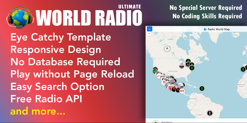 Ultimate World Radio - PHP Script. Explore and stream live radio stations from across the globe through an interactive world map interface.