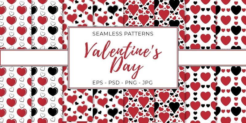 Valentines Day Seamless Textures. 8 Valentine's Day Seamless Patterns in Red & Back Color for Many Decoration Uses.