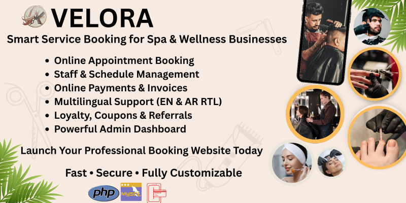 Velora – Wellness Booking Platform PHP. Modern spa & wellness booking system with online appointments, payments, staff management and admin dashboard.