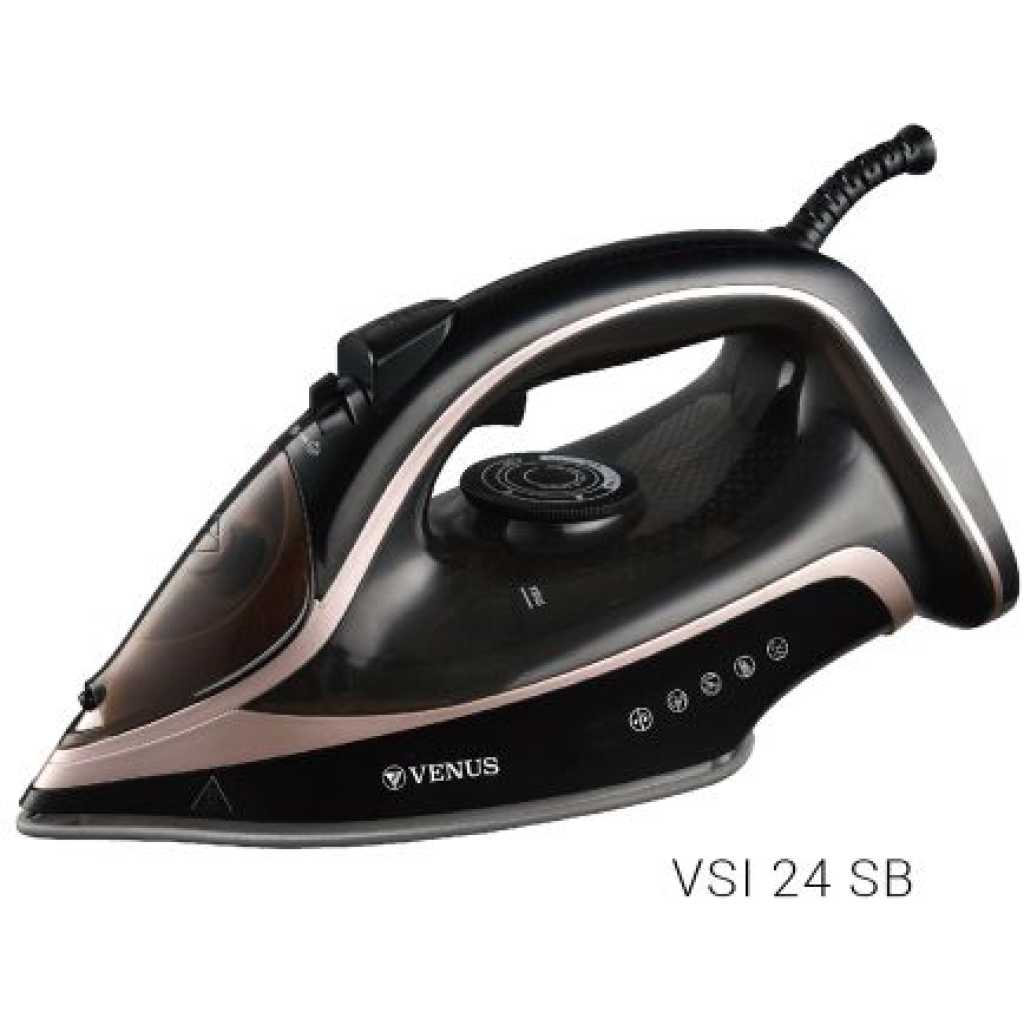 VENUS 2400W Power with Vertical & Steam Burst, Self Clean, Anti Drip, Ceramic Soleplate Steam Iron VSI 24 SB- Black Discover the VSI 24 SB Presenting the Venus high-performance steam iron, equipped with essential features for efficient ironing. The self-clean operation keeps the iron clean and functioning smoothly, while the water sprayer helps tackle stubborn wrinkles. For safety, it includes an auto shut-off feature when idle. The thick ceramic plate ensures even heat distribution and smooth gliding. Experience the burst of steam for tough creases and utilize the vertical steam function for hanging garments. The anti-drip function prevents water leakage, and the large 380 mL water tank minimizes interruptions. Operating at 220-240V, 50-60Hz with 2000-2400W power, it provides powerful and reliable performance for all your ironing needs.