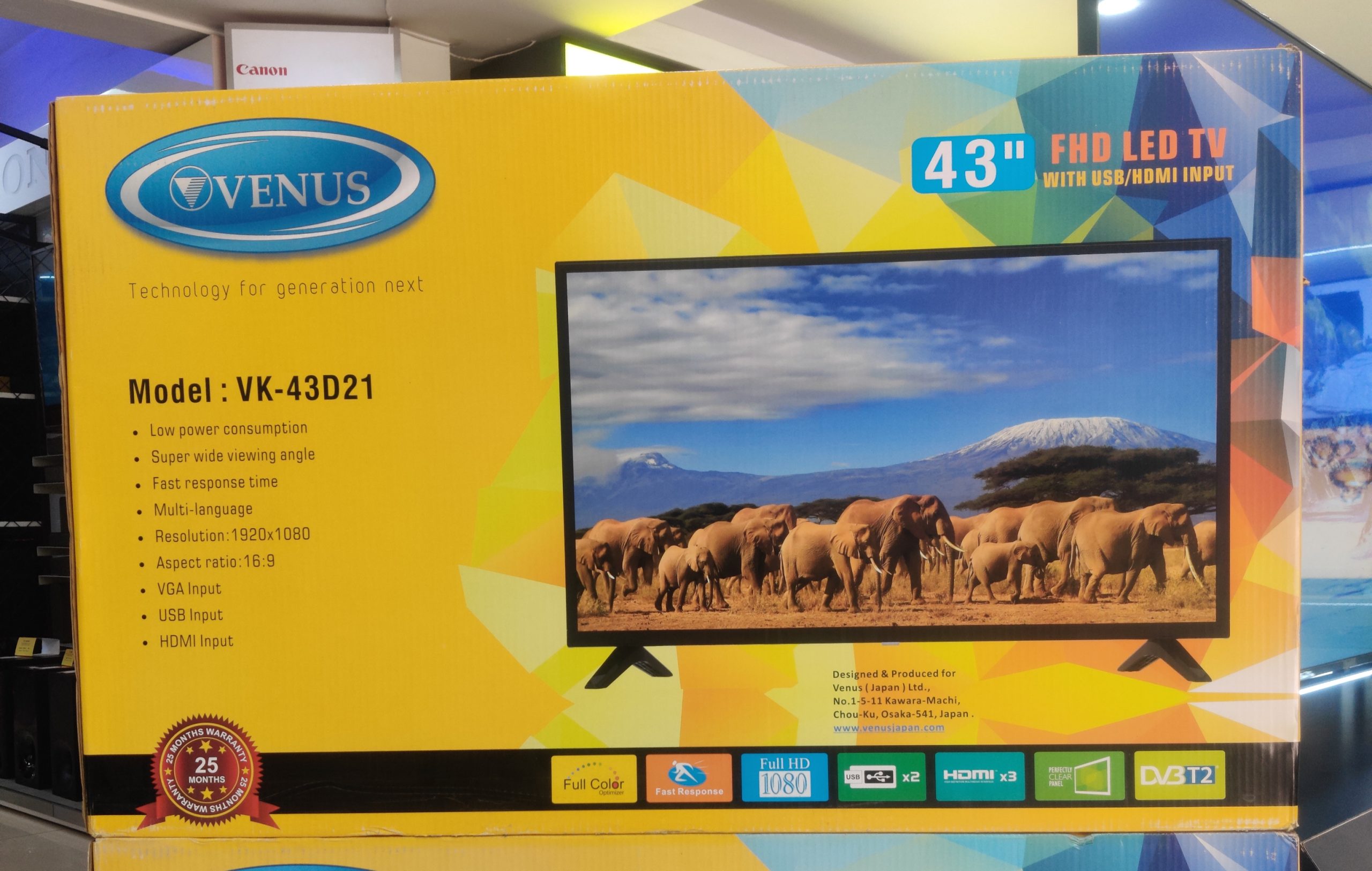 Venus Japan 43-Inch Digital TV VK-43D21; Full High Definition; 3-HDMI, 2-USB, VGA, Digital Tuner DVB-T2, Inbuilt Free To Air Decoder – Made in Japan. Switch on to Venus Digital – Full HD 1080p TV and experience sharper, clearer, more colourfull pictures with five times the detail of standard definition TV. Your TV is ready to entertain with Access to Free Air Local Channels, HDMI input, and VGA (PC Input) connect your PC & use your TV as your FULL HD Monitor, Play Media from USB Multi-format play Full High Definition 1080 Experience exquisite detail and texture on this Full HD TV. Everything you watch is refined to ensure minimum noise and maximum impact. See the difference in buildings and seascapes With clearer and more natural sound whether it’s a movie soundtrack or a music video, you’ll enjoy more balanced mids, highs, and lows. It fine-tunes your TV speakers’ frequency response to ensure precise yet natural sound. ENVIRONMENTAL FEATURES IN THIS PRODUCT Backlight Control, or pixel-level lighting control, help improve energy efficiency by adjusting display brightness as the picture content changes Power Saving Mode helps save energy by adjusting the display brightness Playback through the USB Play music, and video clips and view photo collections all through your TV with super multi-format USB play. Supporting a wide range of codecs, you can experience ultimate format versatility, simply plug in and you’re ready to go.