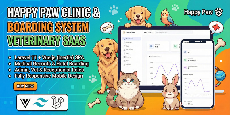 VetMaster - Veterinary Clinic System. Manage patients, appointments, medical records, and pet boarding with this modern Laravel 10 + Vue.js clinic operating system.