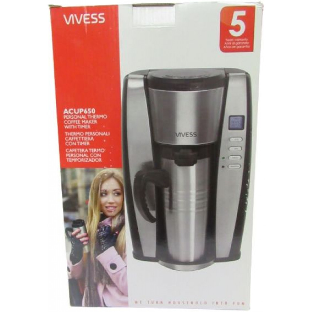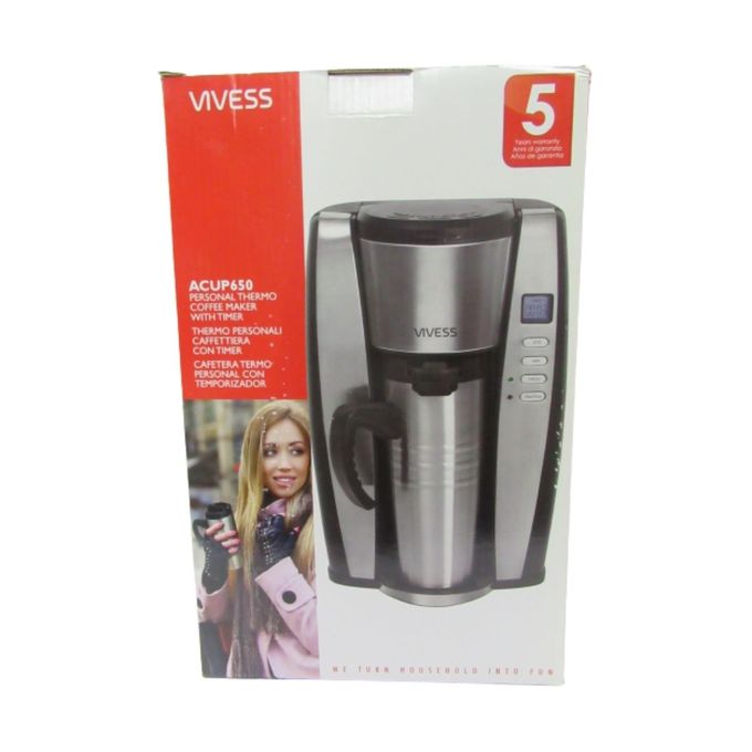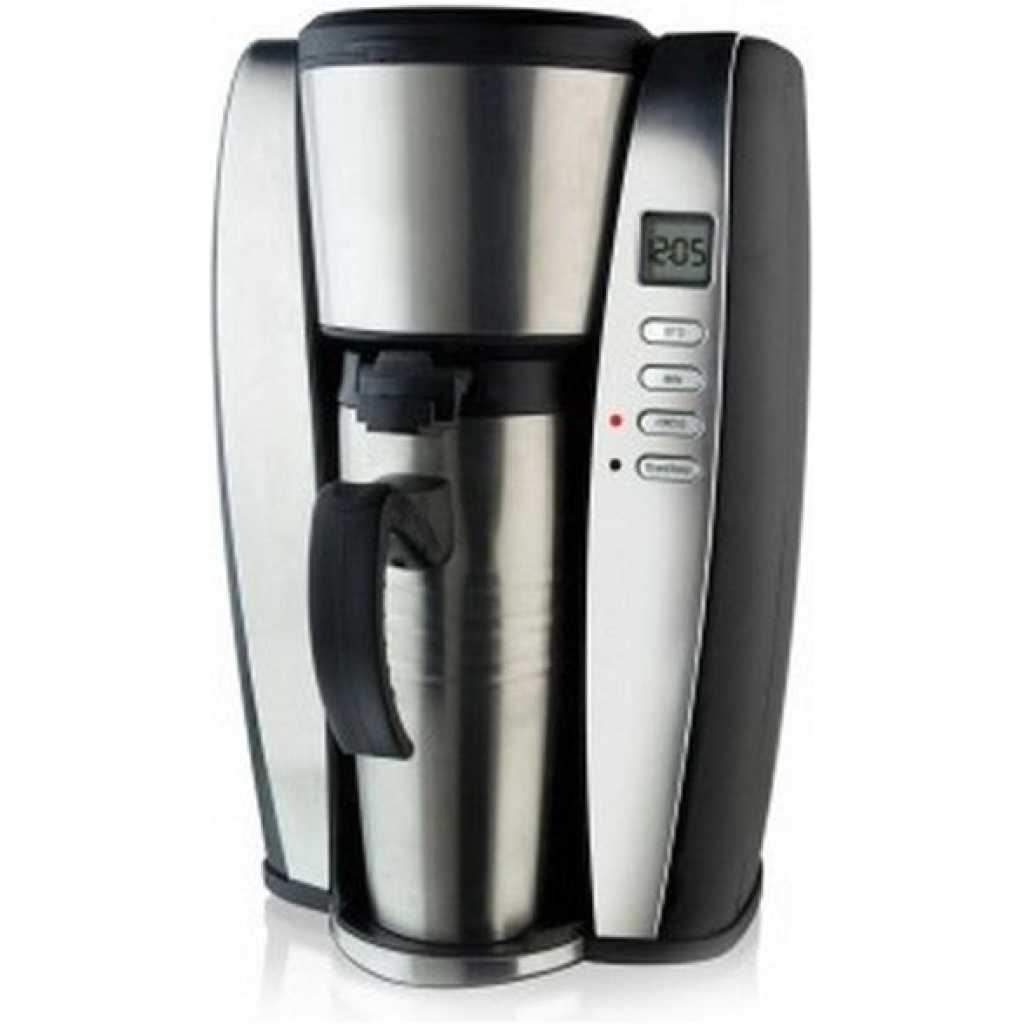 2-Cup (16oz) Personal Coffe Maker LCD Timer Programming Function Power Switch with indicator Light Brews and dispenses one fresh mug a a time Removeable coffe filter basket Stainless steel finish AC Power Inspired by connoisseurs, experts designed this Coffeemaker so you can enjoy the finest tastes from the unique ingredients that you choose. This stylish coffee maker provides you with all the necessary equipment to prepare excellent coffee. Drop for drop and cup for cup in the same consistent quality. Included Mugs! For an active on-the-go lifestyle! Your coffee is brewed directly into the 16-ounce thermal mug and keeps your coffee hot. Permanent Coffee Filter Cleanup is a cinch. No more paper filters, saving you money and the environment. Brew Two Ways Brew two ways for the ultimate convenience. This model handles both ground coffee and pre-packed coffee pods for the brew that you want.