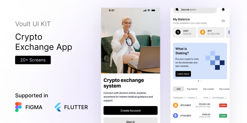 Voult UI Kit Flutter. Voult UI Kit offers 15+ beautifully designed screens for a comprehensive crypto exchange app.