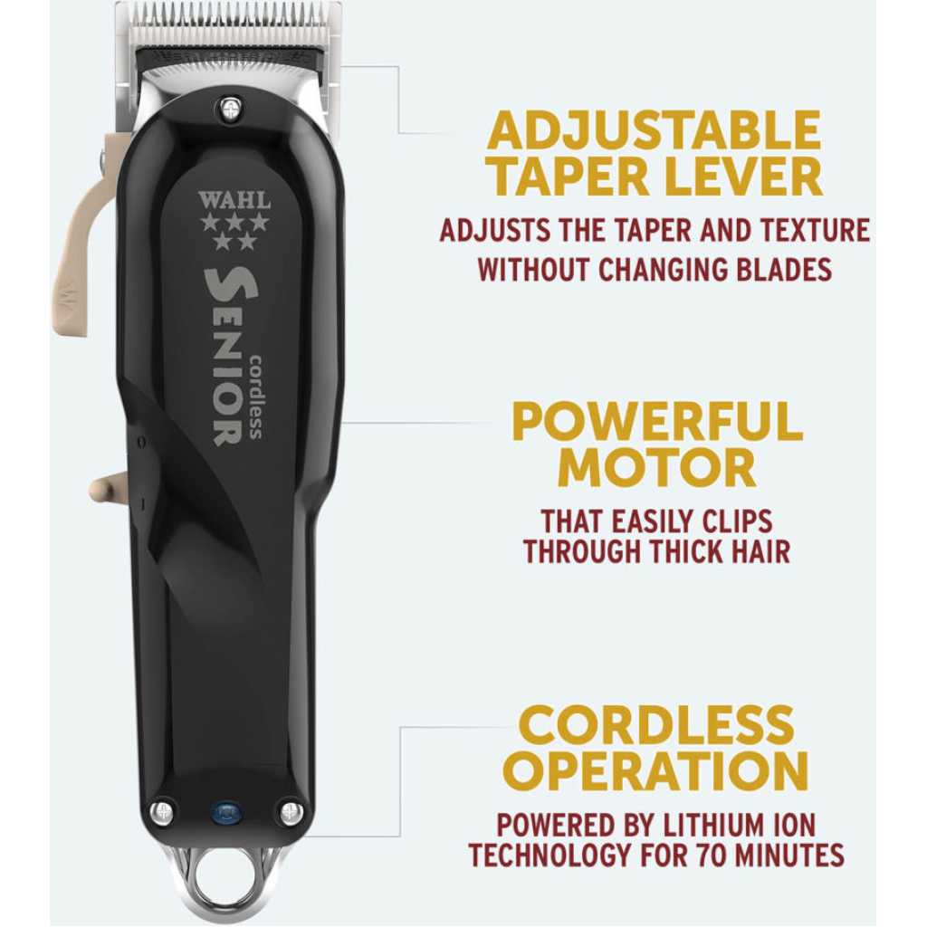 Key Features: Wahl Cordless Senior Clipper; Professional 5 Star Series with Adjustable Blade, Lithium Ion Battery with 70 Minute Run Time for Professional Barbers and Stylists. The Senior Cordless Clipper has an adjustable thin profile blade for precision fades, with a flat bottom that allows for closer cutting The revolutionary Lithium Ion battery technology is lightweight and powerful, providing up to 70 minutes run time from just a 70 minute charge. The blade adjusts to zero overlap for skin tight fading with a thumb adjustable taper lever for increased flexibility. Powerful motor that generates a higher blade speed for more cutting power The aluminium metal bottom housing provides a sturdy, robust grip with a weighted feel for precision and control.