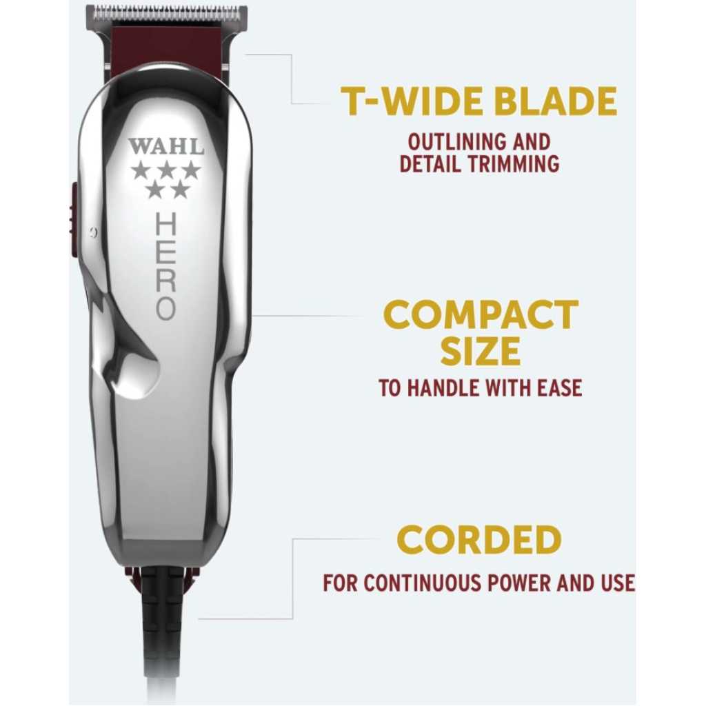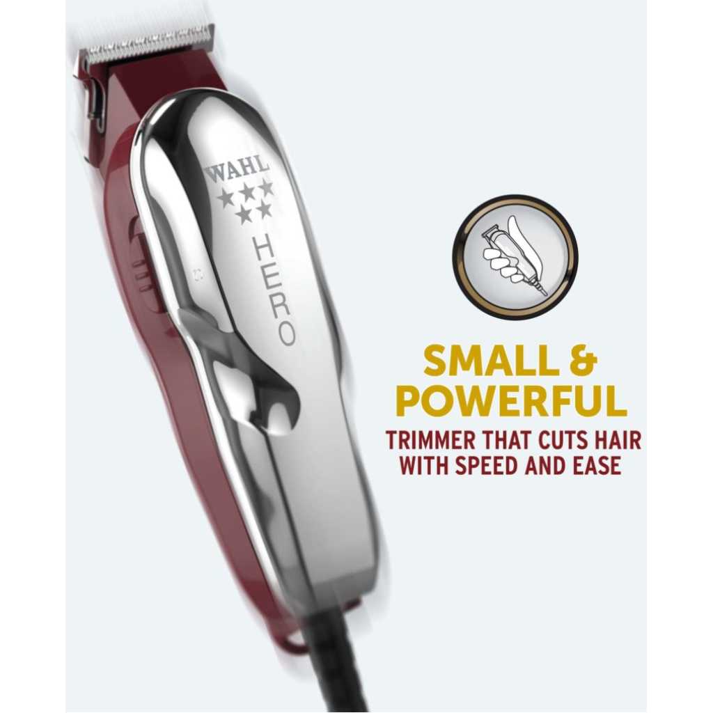 Key Features: Wahl Hero Trimmer; Hair Clipper, Great for Barbers and Stylists – Powerful Standard Electromagnetic Motor – Includes 3 Guides, Oil, and Cleaning Brush- Black, Silver. A powerful Cord trimmer Ideal for continuous use Designed for all the trim and blend work Equipped with a professional rotary engine for durability and longevity T-blade with high precision for processional shaving