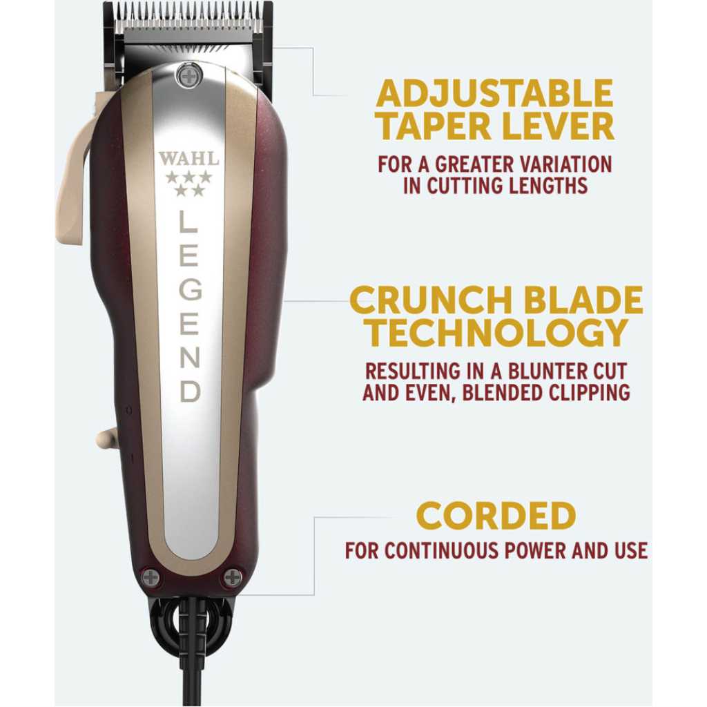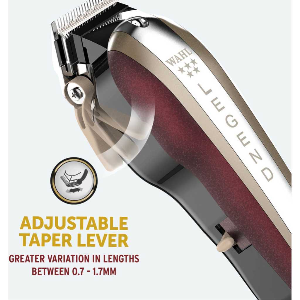 Wahl Legend Professional 5-Star Hair Clipper. Power Battery is high-performance and sturdy for continuous intensive use. Work powerful oscillating armature V9000 D & # X301; very high resistance to wear and X301; a long service life. 5 Star Wedge Blade Head Chrome Precision Cutting System with a new design for smooth cutting and smooth transitions. More Quickly With Enhanced cutting applications where the bristles. Zone of extended cut for greater comfort of fit. Included Includes 8 combs Premium and performance of 4 m Weight 620 g without cable. From the manufacturer From the manufacturer Key Features: Wahl Legend Professional 5-Star Hair Clipper. V9000 motor for ultimate durability 5stars series Can also be adjusted to zero overlap Power adapter for UK included