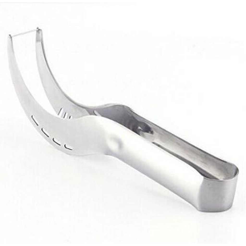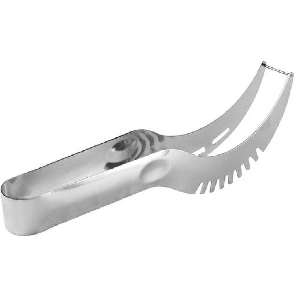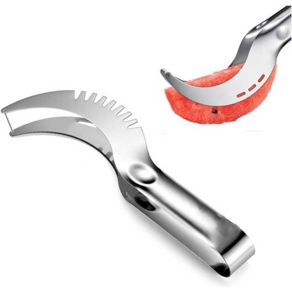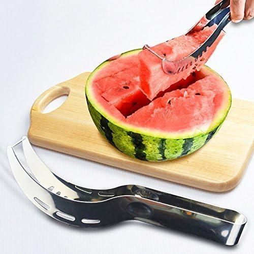 Watermelon Slicer, Watermelon Knife & Fruit Slicer Fastest Cutter Multi-purpose Stainless Steel, Smart Kitchen Gadget Efficient Cutting This watermelon cutter is specially designed for cutting watermelons. First, cut the watermelon vertically and then cross-cut the watermelon. We will quickly cut the watermelon slices into squares, making you and your family and friends enjoy the sweet watermelon pieces. Safe Durable Made from 304 stainless steel, certified, rust-proof, drop-resistant, wear-resistant, durable, and safe to use. The unique rounded edge and non-sharp blade design protect your hands well. Easy to Use The watermelon slicer is easy to use without additional tools and does not dirt your hands. You can quickly and easily cut into watermelon fruits with a simple step. The unique design allows you to cut the perfect cube-shaped watermelon slice every time. Lightweight Portable The lightweight and compact design makes it easy to use, carry, and store, which is very suitable for home or outdoor camping. The watermelon cutter is easy to clean, just rinse with water to keep it clean after use. You can easily cut the watermelon into pieces and eat it with a fork. Simplify the cutting process, only 10 seconds can be evenly cut into watermelon pieces. Watermelon special design, not easy to hurt hands. It’s good for parties and restaurants to cut fruit. Stainless steel makes cleaning easier and can be cleaned with a dishwasher. COMFORTABLE HANDLE The handle is ergonomic, comfortable to hold, and more labor-saving to use. SHARP BLADE A fine grinding blade makes it easier to cut watermelon. DIVIDING GROOVE The groove can cut the watermelon into small pieces with uniform size and exquisite appearance. Package: 1 pack