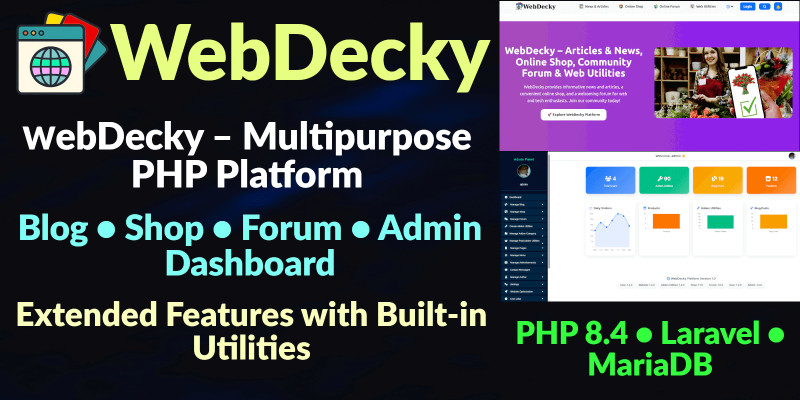 WebDecky - PHP CMS Shop Forum Platform. All-in-one PHP platform with blog, e-commerce shop, community forum, admin dashboard, and built-in web utilities.