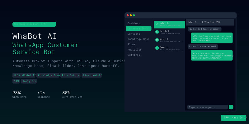WhaBot AI - WhatsApp Customer Service. AI WhatsApp customer service bot with GPT-4o, Claude & Gemini. Knowledge base, flow builder, live handoff, CRM. Next.js 14.