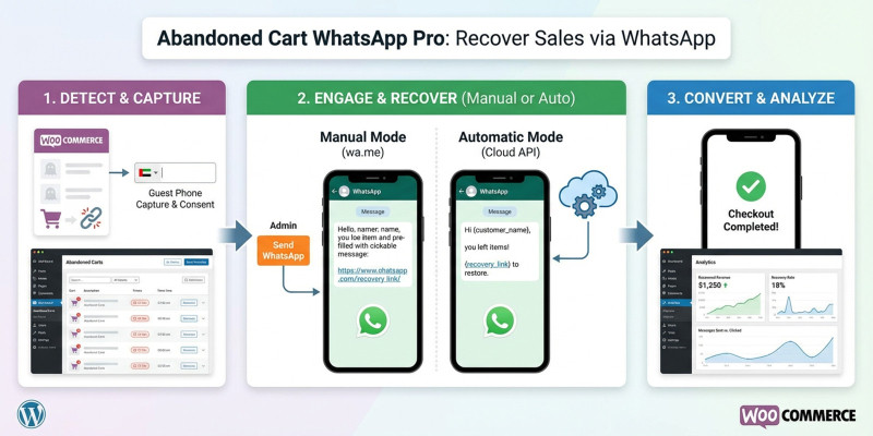 WhatsApp Abandoned Cart Pro for WooCommerce. Send automatic WhatsApp reminders to customers who leave items in their cart. Recover lost sales on autopilot with smart recover
