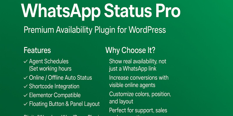WhatsApp Status Pro - WordPress Plugin . Display your team’s WhatsApp availability with real working hours and auto online/offline status.