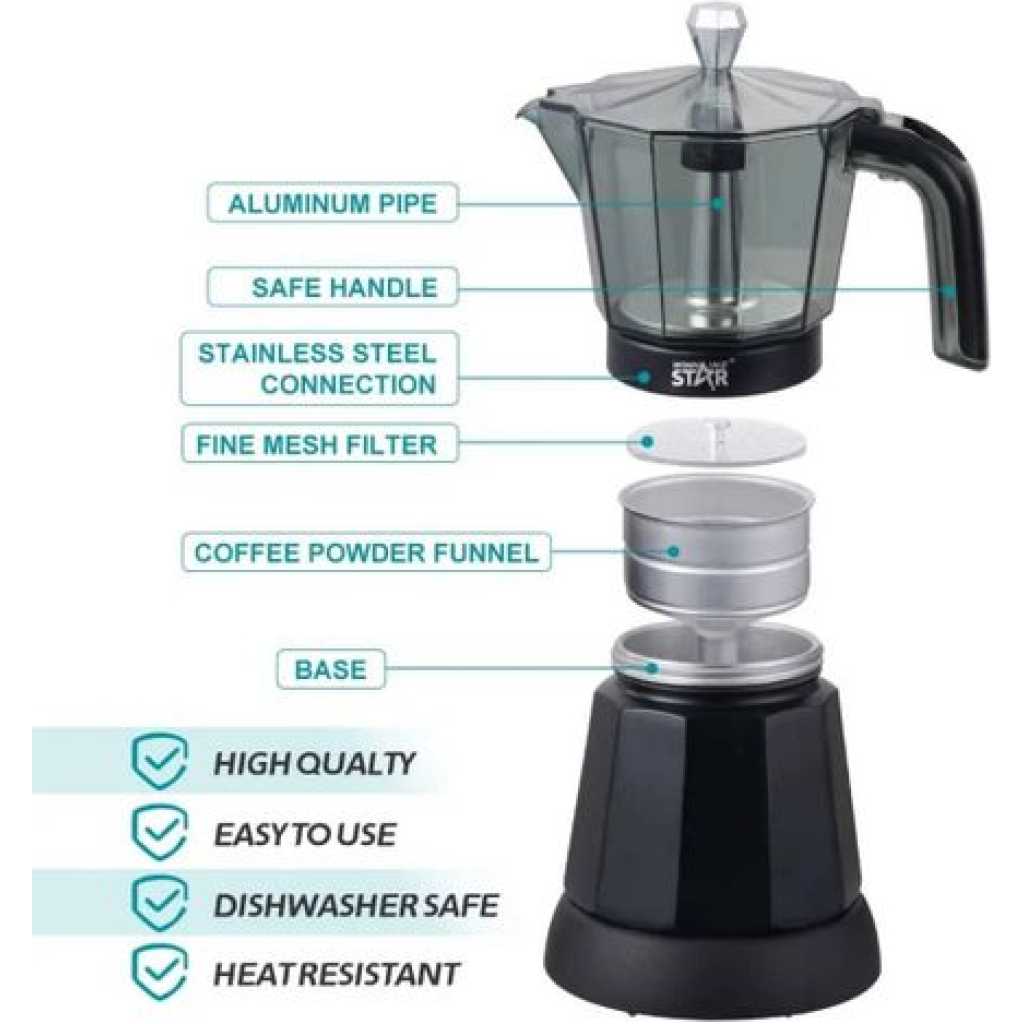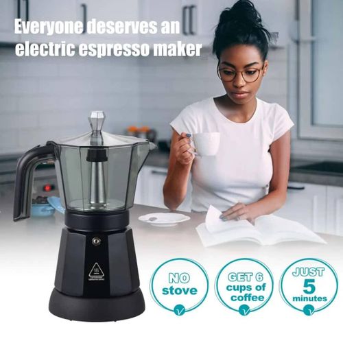 Key Features: Durable: High quality ABS, acrylic, silicone, aluminium alloy and muffle paint make this espresso machine stable, heat-resistant, shockproof, wear-resistant and corrosion-resistant. The product is heat-resistant, shockproof, wear-resistant and corrosion-resistant, so it can stay beautiful and practical for a long time. High efficiency: 480 W power, the high-quality heating element, the principle of distillation extraction pressure and the maximum pressure of 2.5 bar can achieve even heating and delicious coffee for you in a short time. 【Suitable Capacity】: The total capacity of 12.68 oz can meet the needs of 1-6 people at the same time and is a good choice for families, so you can make delicious coffee with your family and friends at home. The 10 x 19 cm mini design, the weight of 2.49 lbs, and the separation design of the pot and the bottom make it easy to store and store. Safety protection: the comfortable, anti-scald and non-slip handle that solves the common problems of grip and finger burns, the double leak protection and the safety valve on the handle. The double leak protection and the safety valve on the surface, which can protect you from the accumulation of high pressure, ensure safety, so you can use it with confidence. Practical and simple: Complete accessories, detailed English instructions, a pilot light, a one-touch button and a simple structure allow complete accessories, detailed English manual, indicator light, a one-touch button and a simple structure allow you to install and put the device into operation in no time. The transparent control panel on the top allows you to view the internal situation and make settings in a timely manner.