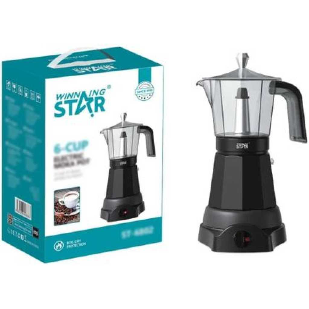 Warm and delicious coffee can dispel our fatigue and feel the happiness of life. Made of ABS, acrylic, silicone and aluminum alloy and using a painting process, our espresso machine can be used for a long time. Made of ABS, acrylic, silicone and aluminum alloy and equipped with a painting process, our espresso machine can be used for a long time. 480 W power and a high-quality heating element make it possible to start a wonderful journey in a short time. The power of 480 W and the high-quality heating element make it possible to start a wonderful journey in a short time, which allows you to better explore the beauty of life. Details: Round corners: Compared to traditional angular corners, an arc-shaped design can better prevent your skin from being scratched. Long power cord: The 3.94 foot long cable provides enough disposable length for easy placement and can better protect your safety. Anti-drip nozzle: This nozzle provides a softer and more even liquid flow, prevents splashes and drops, giving you a better experience. Stable base: The detachable base (5.7 x 6.7 inches) with 360° rotation is not only convenient for you to use, but also increases the stability of the product. Product Silicone sealing ring: It can effectively prevent leakage, keep the table clean and save your cost. Usage: This product is suitable for 1-6 people and can be widely used in families, meetings, cafes, offices, student houses, milk tea shops, travel, business trips etc. This product is suitable for 1-6 people and can be used in families, gatherings, cafes, offices, student houses, milk tea shops, traveling, business trips, etc. for making various beautiful coffees yourself. This WINNING STAR ST-6802 Electric Moka Pot is made from high-quality Nylon, die-cast aluminum, and PC material, ensuring durability and safety. It features a 480W power output with AC 220V-240V voltage support, automatic rebound power-off, anti-dry burning function, and a working power indicator for added convenience How to use: 1. Turn the top jug to open. 2nd 2. Remove the powder dispenser and lid. 3. Put a suitable amount of water in the bottom pot (hot water can also be used). 4) Place the powder dispenser in the lower container. 5. Screw the top pot. 6. Place the product in the heating base, press the button and the red indicator light lights up to indicate that it is working. Technical data: Colour: silver. Material: ABS, acrylic, aluminum alloy, silicone. Surface treatment: muffle lacquer. Plug standard: EU standard Assembly required: yes. Mounting: Freestanding. Rated voltage: 220 V. Nominal frequency: 50 Hz. Consumption: 480W Maximum pressure: 2.5 bar. Number of articles: 1 Total capacity: about 300ml/12.68oz Suitable people: 1-6 Dishwasher safe: no. Base rotation: 360 degrees. Net weight: 1.14 kg. Gross weight: 1.2 kg. Product Dimension(D*H): 10.2 * 19.5cm/4 * 7.68 inch Dimensions of the base: 17 x 14.5 cm. Package dimensions: 18 x 15 x 27 cm. Power cord length: 1.2 m. Box contents: 1 x espresso machine. 1 x base. 1 x English user manual. Notes: 1. Please follow the instructions for use and follow the safety instructions in the instructions (English language not guaranteed). 2. Please note that the package contains only one espresso machine and no coffee. 3) Do not put the appliance in the dishwasher, but let it dry in time after cleaning. 4. New products need a shrinkage time, and after shrinking, putting on will be very smooth. If the portion size decreases during shrinkage, the device will no longer work properly.