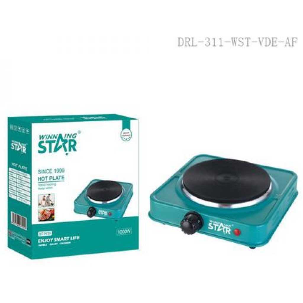 Winningstar 1000W Single Burner Heater Hot Plate with 3*0.75*80cm Charging Cable VDE Plug- Green. There’s no need to sacrifice your favorite home-cooked meals simply because you choose to explore or travel! With this sleek Burner Cooktop, you can prepare those home-cooked meals with ease no matter where you are, so long as you have an electrical outlet, you are ready to cook up a storm! This ultra-lightweight and compact cooktop brings the power of your stove to any desired location. An essential product for every kitchen and home Now need not be worried in case the LPG gas is exhausted in between cooking your meal. It is beneficial for housewives, working It is an alternative to cooking gas having 1000 watts power, and works on a normal 6 amperes socket. It is suitable with aluminum, and steel utensils,t is safe, provides faster heating, and is for household cooking. Also, the strong metal body is durable unlike induction cookers Key Features: Winningstar 1000W Single Burner Heater Hot Plate with 3*0.75*80cm Charging Cable VDE Plug- Green. One cooking plate One operating on/off indicator light Various heat operation One auto-thermostat Overheat protection Non-stick coating Power: 1000W+1000W