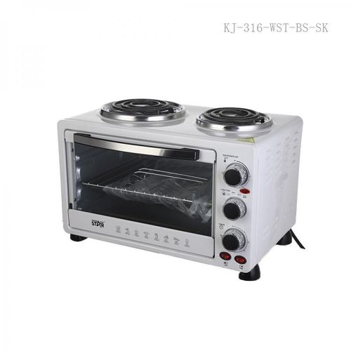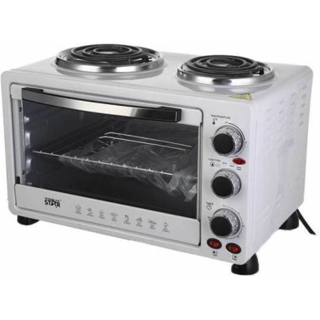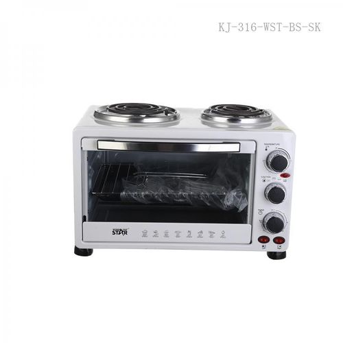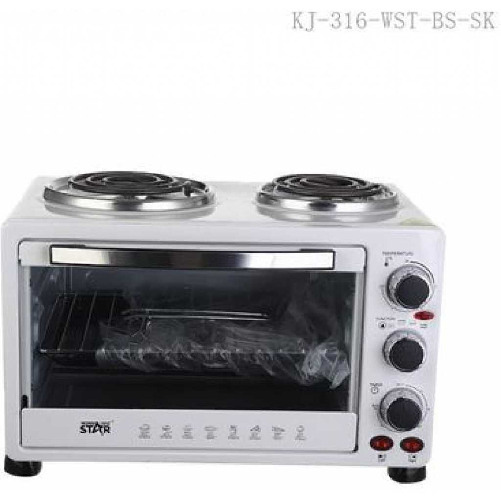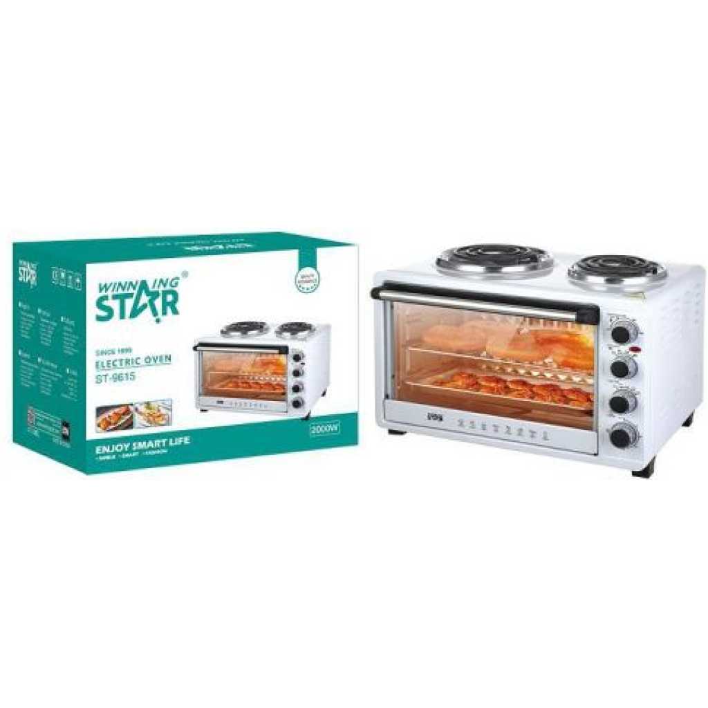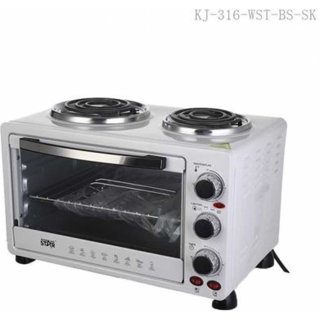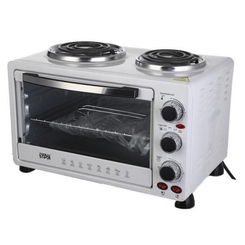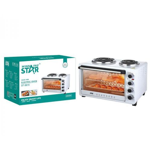 Winningstar 45L Electric Convection Oven With 2 Coil Hot Plate Heating Mode 3 Timer- White. Meat can be skewered on the pit, and cooked on this horizontal rotisserie. After using the rotisserie pit for grilling, the hot rod can be removed from the oven using this handle. It’s commonly used for baking and roasting. The oven is equipped with 2 hot plates on top for multi-purpose cooking. The oven can heat from the top to provide broiling and grilling. It also provides an integrated rotisserie. The rotation cooks the meat evenly on its own juices and allows easy access for continuous self-basting. Accessories: Baking tray, Wire rack, Tray handle Grill handle, Rotisserie pit Key Features: Winningstar 45L Electric Convection Oven With 2 Coil Hot Plate Heating Mode 3 Timer- White. 45 litres capacity 60 minutes timer with bell ring Adjustable thermostat 4stages heating Heat-resistant glass window 100-250 Degree 2 hot plates