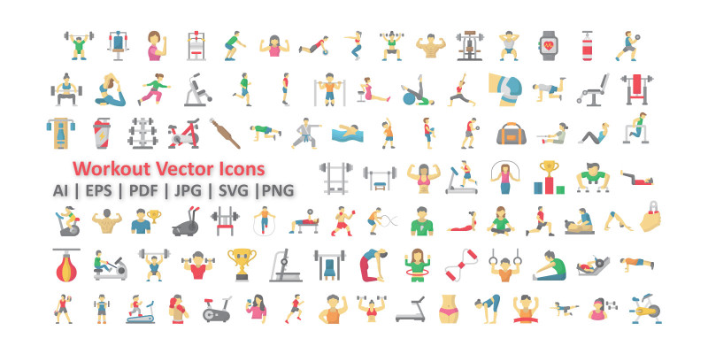 Workout Vector Icons Pack . Workout vector icons for apps, posters, and digital guides. Includes exercises, equipment, and fitness styles in AI, PNG, SVG more