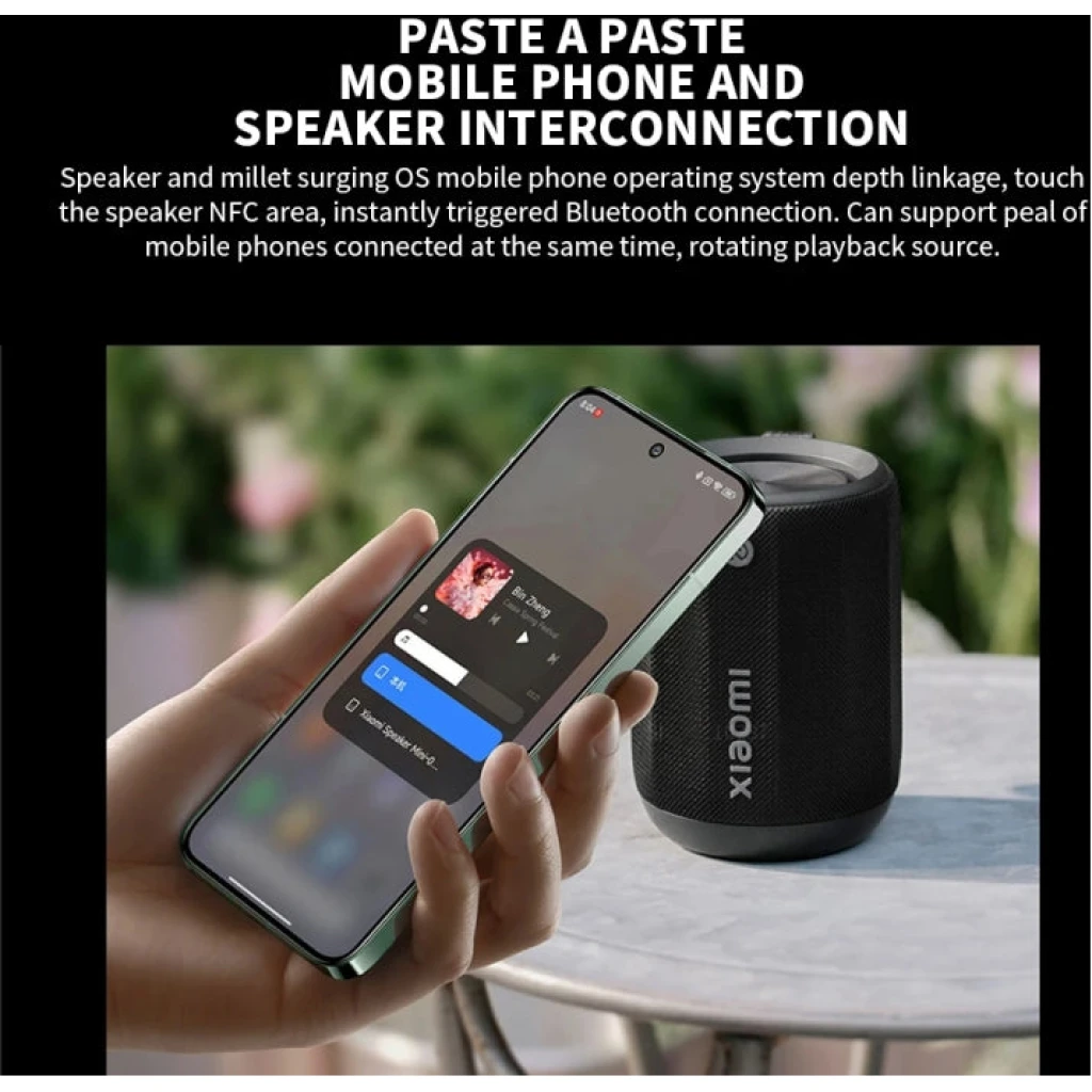 Key Features: Xiaomi Bluetooth Speaker Mini Support NFC Connection(Black). 1. Equipped with Bluetooth 5.3 technology, fast connection and stable transmission. 2. The top RGB atmosphere ring light strip, music sounds, sound and light are linked, full of atmosphere. 3. IP67 dustproof and waterproof design, the body is made of woven mesh, wear-resistant and durable, and the bottom of the body is shock-absorbing soft rubber to alleviate the damage to the body caused by sudden impact. 4. Built-in 2000mAh battery, full power supports 11 hours of music playback, long-lasting battery life.