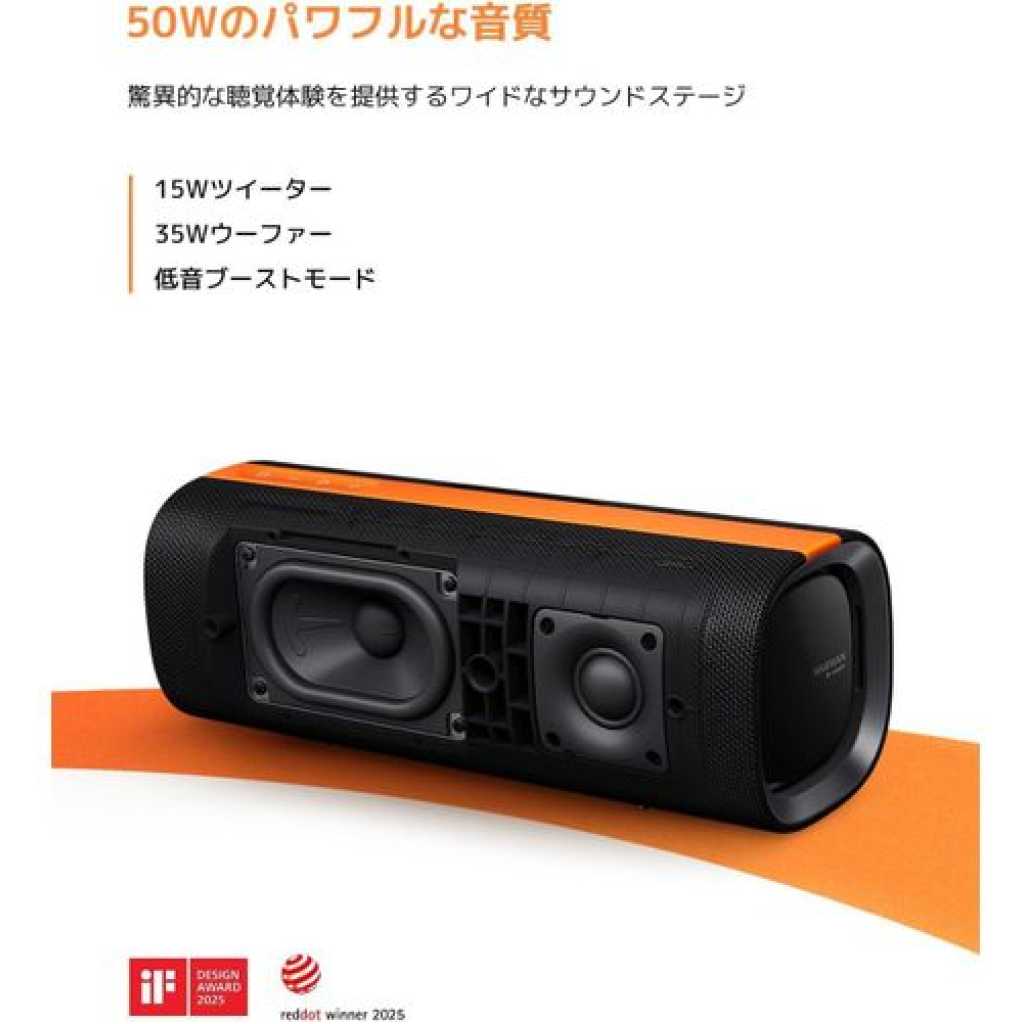 Key Features: POWERFUL SOUND OUTPUT: Features 50W total power with 35W woofer and 15W tweeter, enhanced by Harman AudioEFX for superior audio quality. EXTENDED BATTERY LIFE: Up to 26 hours of playback at 50% volume, with PD fast charging support and convenient reverse charging capability. WATERPROOF DESIGN: IP67-rated construction ensures protection against water and dust, making it perfect for outdoor use. SMART CONNECTIVITY: Bluetooth 5.4 with 25-metre range, supports TWS pairing for stereo sound, and Party Connect for linking up to 100 units. PREMIUM FEATURES: Includes 3D ambient lighting effects, Bass Boost mode, built-in microphone, and hidden handle for easy portability.