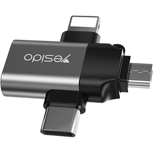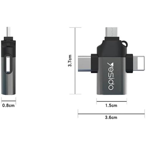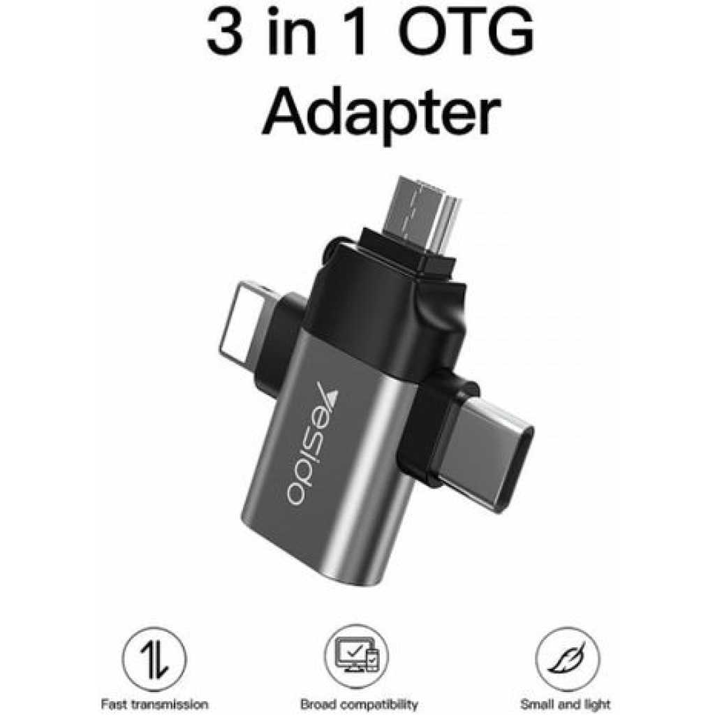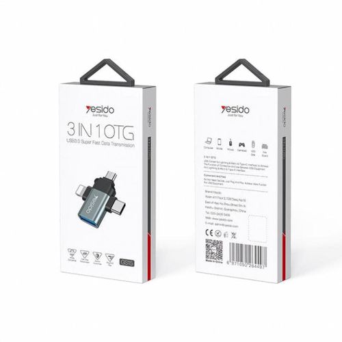 Yesido 3 In 1 OTG USB 3.0 Super Fast Data Transmission Adapter GS15- Multicolor Three-in-One Design: The GS15 adapter is a multifunctional solution that offers three types of connectors in one compact device: USB 3.0 Type-A Female: This standard USB port lets you connect USB flash drives, external hard drives, keyboards, mice, and other USB peripherals to your devices. Type-C Male: This is a Type-C connector designed for modern Android smartphones, tablets, and other devices with Type-C ports. It allows you to connect Type-C accessories and devices. Lightning Male: The Lightning connector is compatible with Apple devices, including iPhones and iPads. It ensures that Apple users can also connect a variety of USB peripherals to their devices. Micro USB Male: The Micro USB connector is compatible with older Android devices and various other electronics that use Micro USB. It ensures compatibility with a wide range of devices. Universal Compatibility: The Yesido-GS15 adapter is designed to work with a wide range of devices. Whether you have a modern Android smartphone with a Type-C port, an Apple device with a Lightning port, or an older device with a Micro USB, this adapter ensures compatibility and seamless connections. Product performance description 1. Compact size and convenient to use, plug and play. 2.3 in 1 Otg Adapter USB 3.0 Female to Type C/ For iPhone /Micro USB Male Adapter 3. Super speed USB 3.0 5Gbps data transmitting rate. 4. Could connect with mouse, USB Flash disk, keyboards, camera, card reader, etc. 5.Work for Tablet & Hard Disk Drive & Flash Disk & USB Mouse etc.