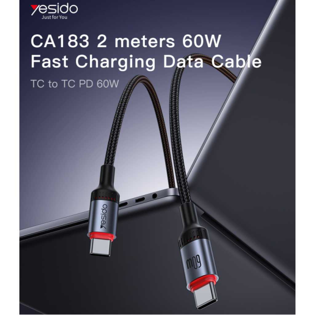 Yesido CA183 2M PD60W Fast Charging Type-C To Type-C 48-Strand Braided Cable Power LED Light Data Cable